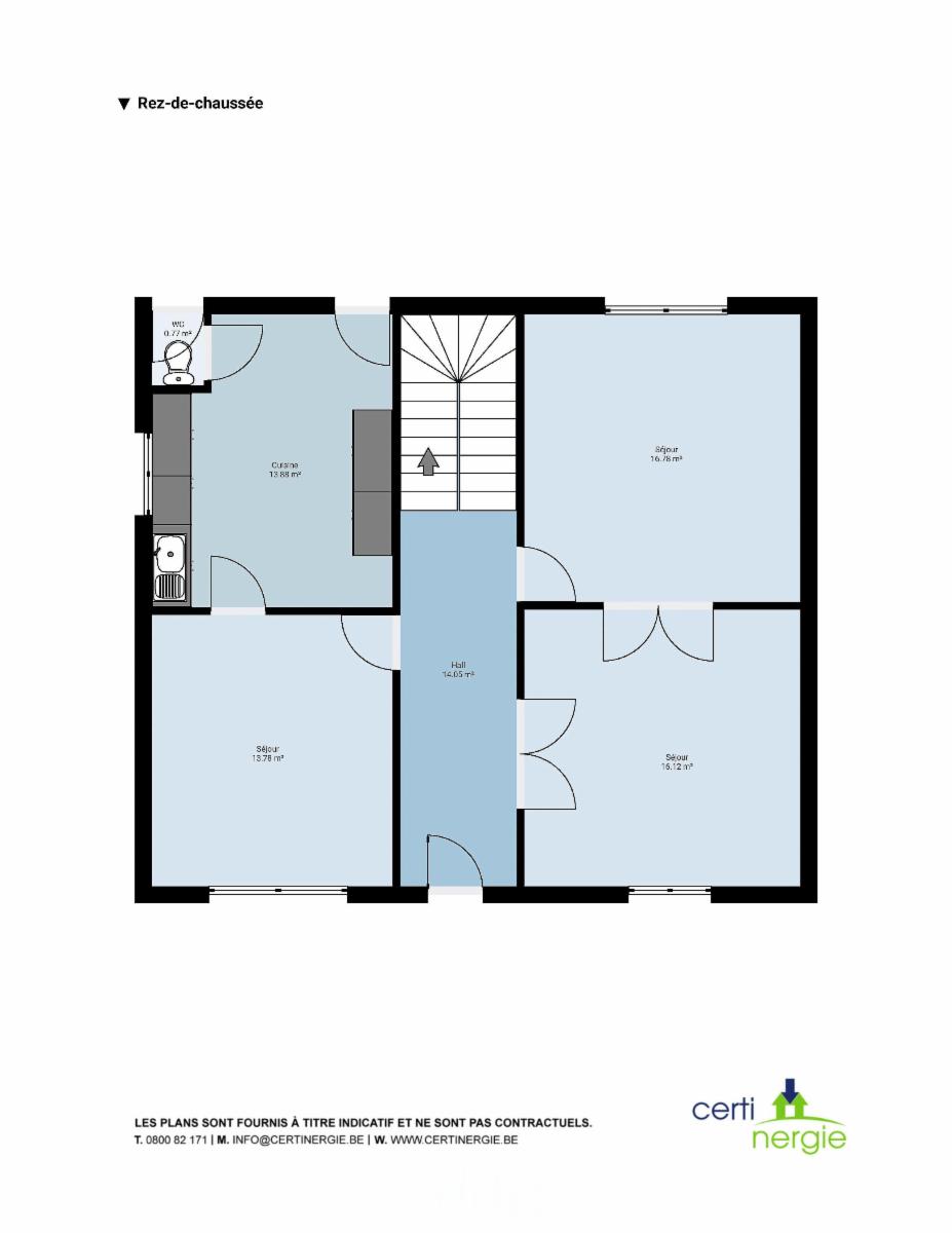 • Rez-de-chaussée : Un hall d'entrée central avec la cage d'escalier apparente dans le fond A droite vaste pièce à usage de salon salle à manger séparée par un triple porte centrale vitrée, A gauche du hall d'entrée un séjour suivie sur l'arrière une cuisine semi équipée et d'un wc.