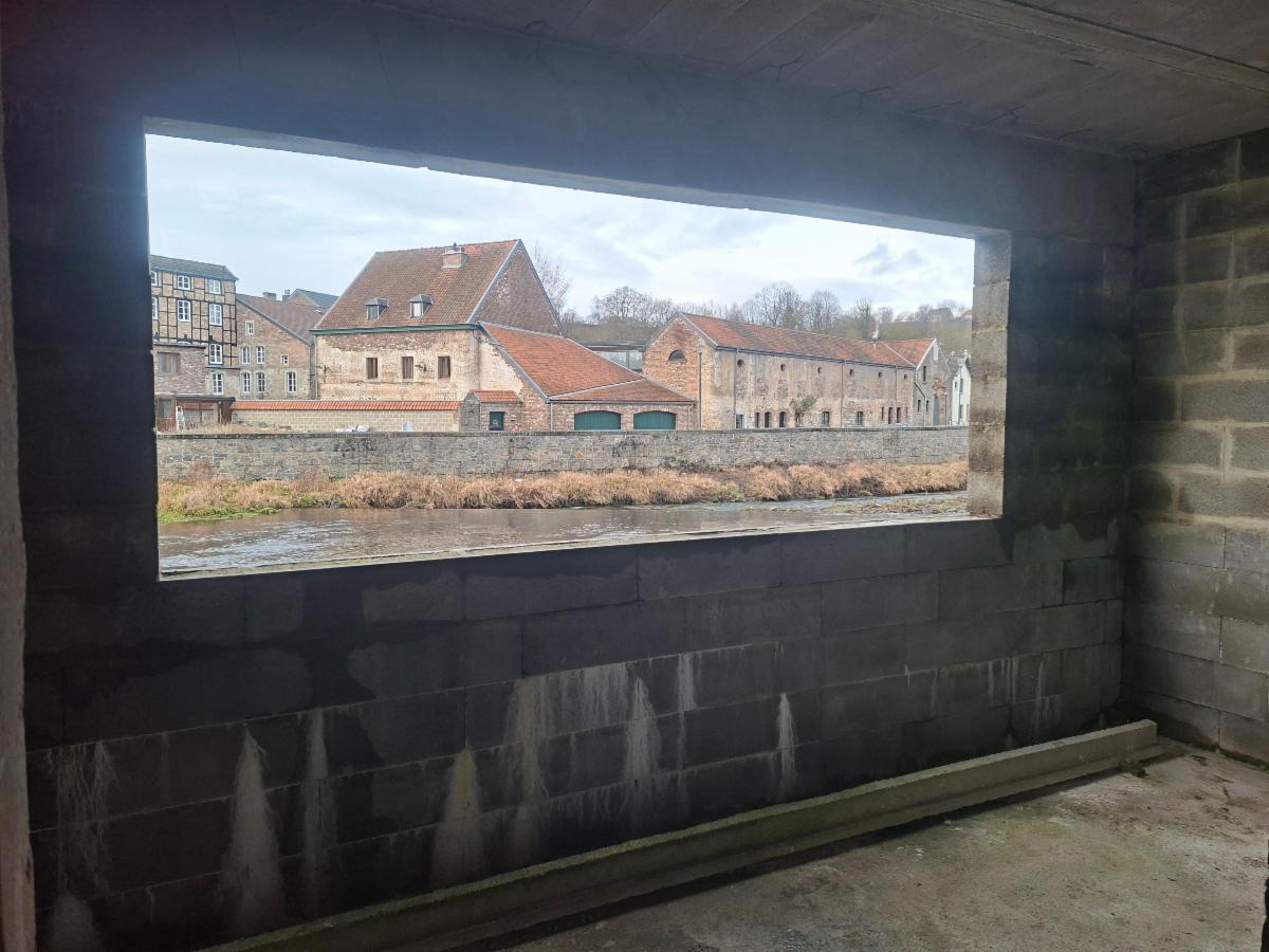 Le bien a été sinistré lors des inondations de 2021. Des travaux ont été entamés par le propriétaire, notamment la réalisation d’un mur anti-inondation, la pose d’une chape en béton armé au rez-de-chaussée ainsi que l’installation d’un clapet anti-retour sur le réseau d’évacuation. À l’arrière, la maison profite d’une vue dégagée sur le cours d’eau. Le mur anti-inondation, réalisé lors des travaux, crée un encadrement architectural qui met le paysage en valeur, à la manière d’un tableau.