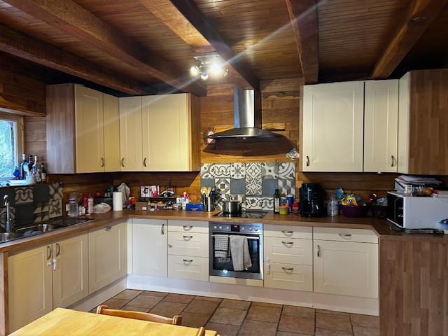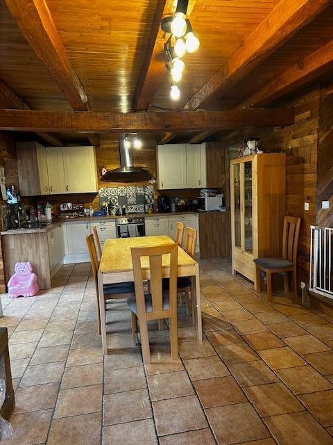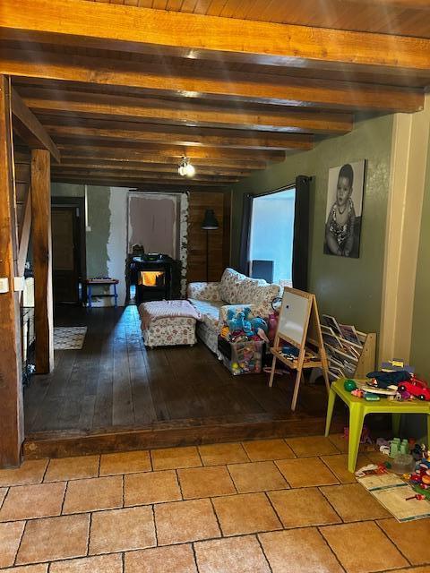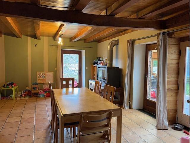Rez de chaussée : vestibule d’entrée avec âtre chaleureux, équipé d’un poêle à pellets, espace salon avec plancher en chêne, salle à manger avec cuisine équipée, véranda donnant sur le jardin et terrasse offrant une vue sur tout le village, WC, buanderie, et vaste pièce présentant un volume sur deux étages en pierres du pays, offrant de belles possibilités d’aménagement.