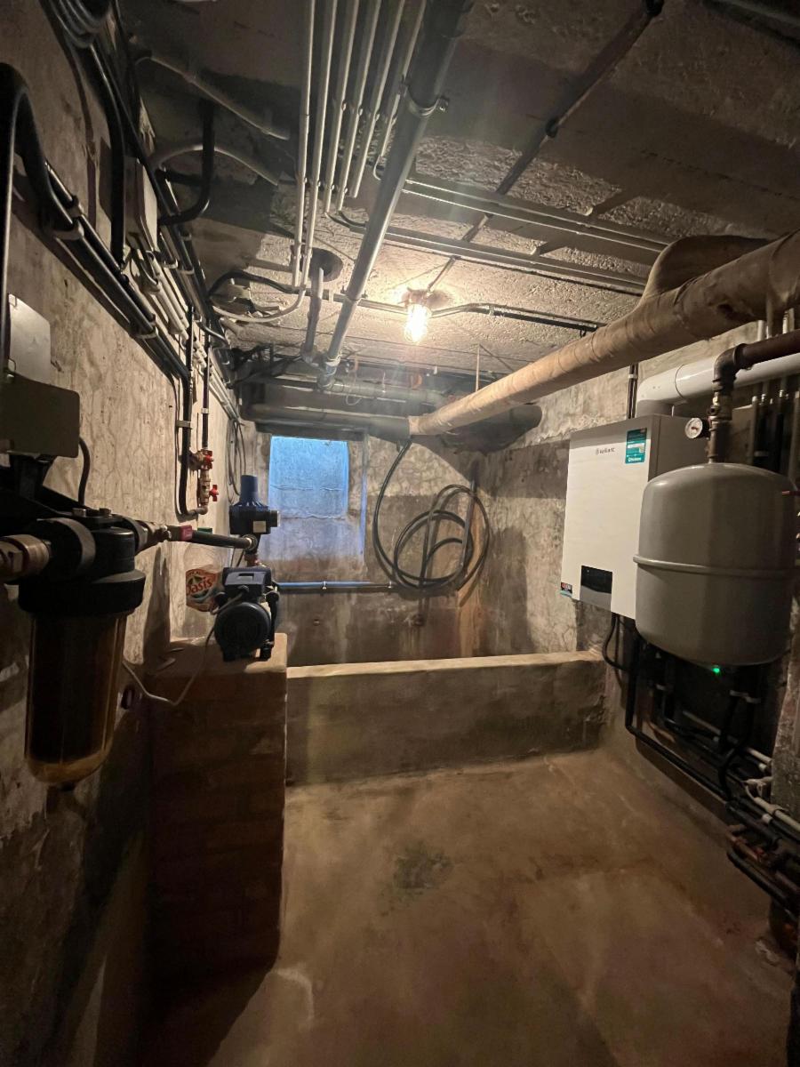 Aspects techniques: chauffage central au gaz de ville, égout et fosse septique, citerne eau de pluie avec pompe (6200 litres), adoucisseur d'eau, toit isolé en partie, pas de citerne, châssis double vitrage.