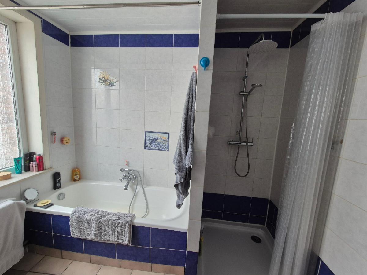 Au RDC, le hall d'entrée (13 m²) et le salon (45 m²), organisés en deux pièces avec superbe carrelage d'époque, une salle à manger de 12 m² avec rangement encastré, une cuisine super-équipée (évier simple, taques vitrocéramiques, four électrique neuf, rangements, lave-vaisselle neuf, hotte), couloir (2,5 m²), salle de bains (douche large, baignoire, deux éviers, miroir, rangement) (7,5 m²), buanderie avec WC séparé (10 m²);