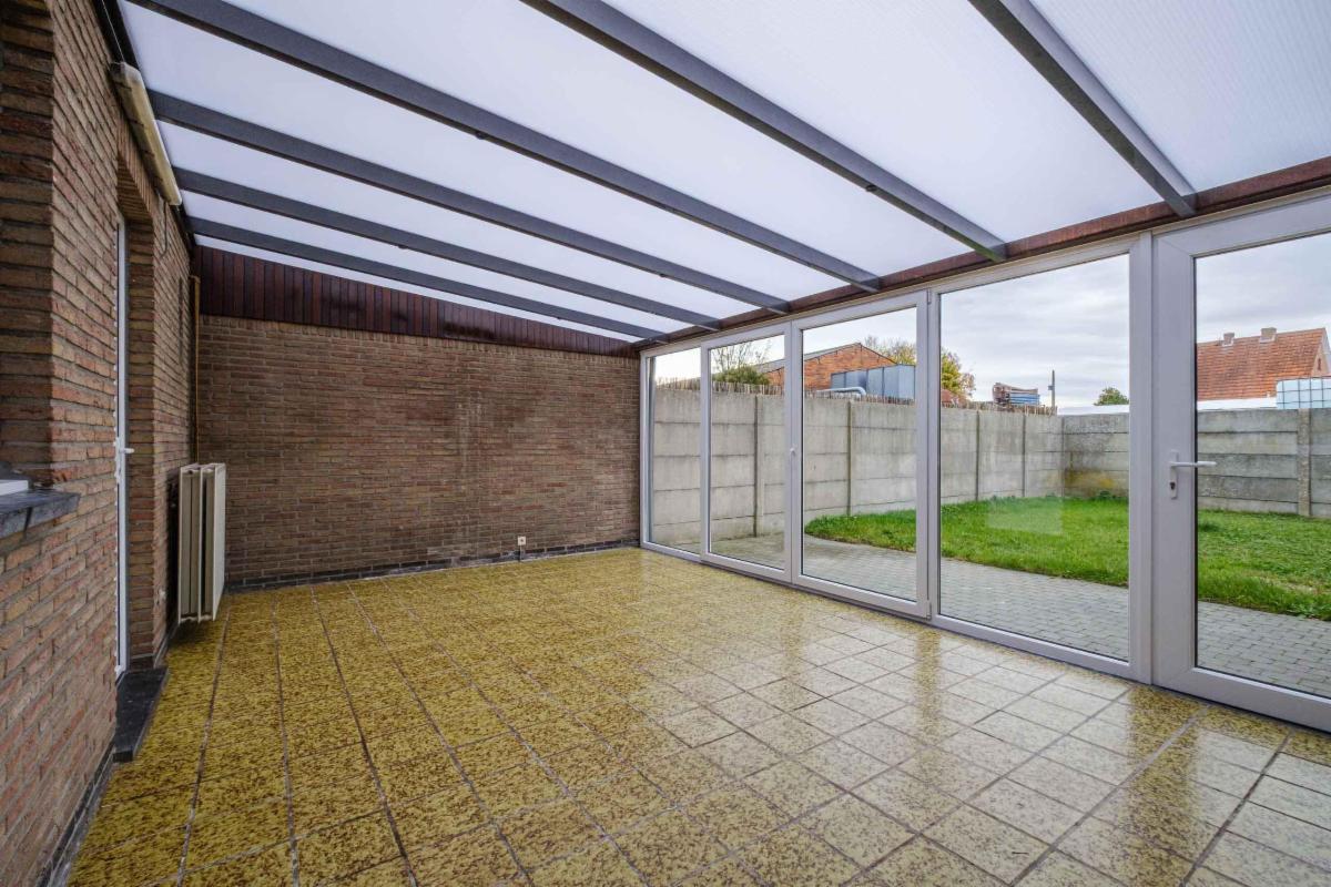 La cuisine donne également accès à la véranda (23 m²) qui permet d'accéder à la fois au jardin entièrement clôturé et au garage. Le garage est équipé d'une porte basculante en bois et est également accessible par une porte classique située le long de l'allée.