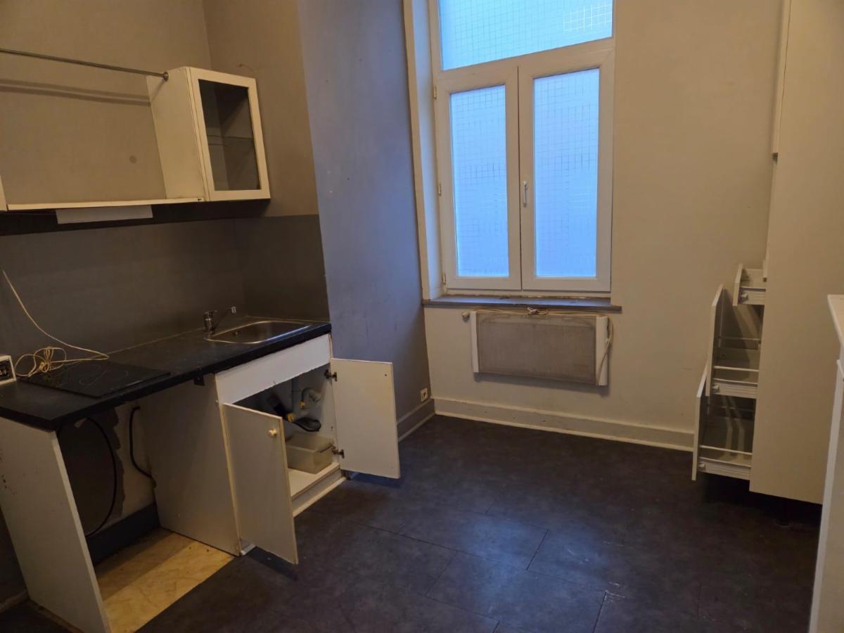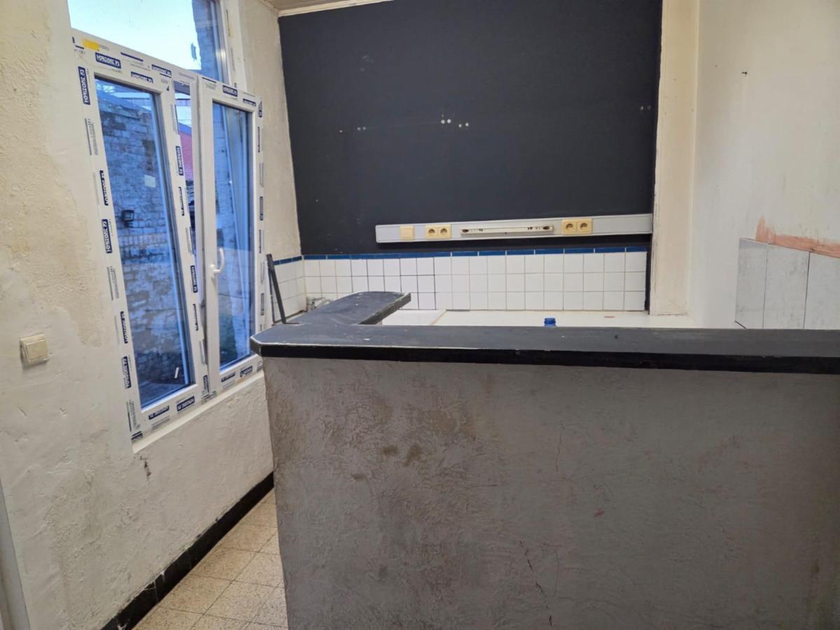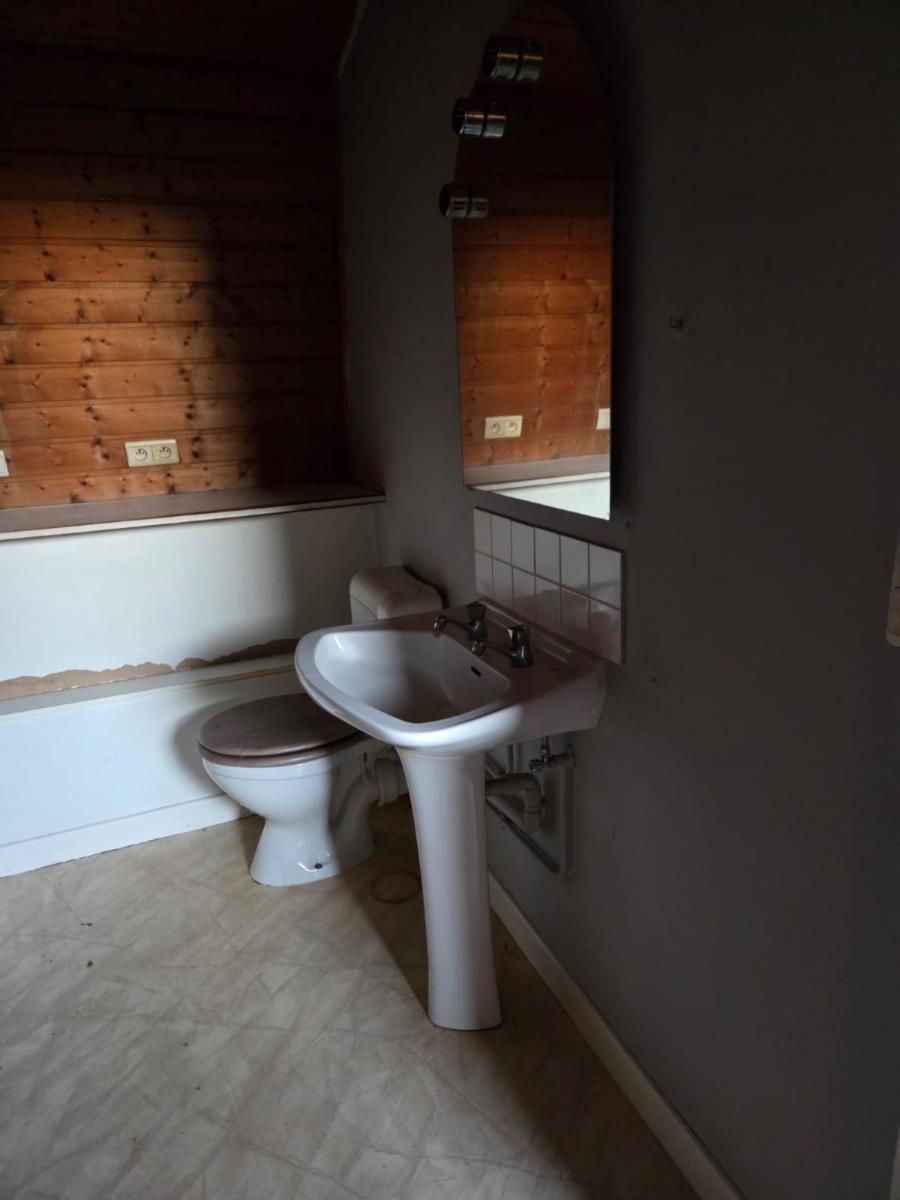 Rez-de-chaussée : un hall d’entrée, sur la gauche un bureau avec plancher en bon état, un salon, une pièce de vie et un salon d’hiver-véranda, un WC ainsi qu’un espace prévu pour la cuisine.