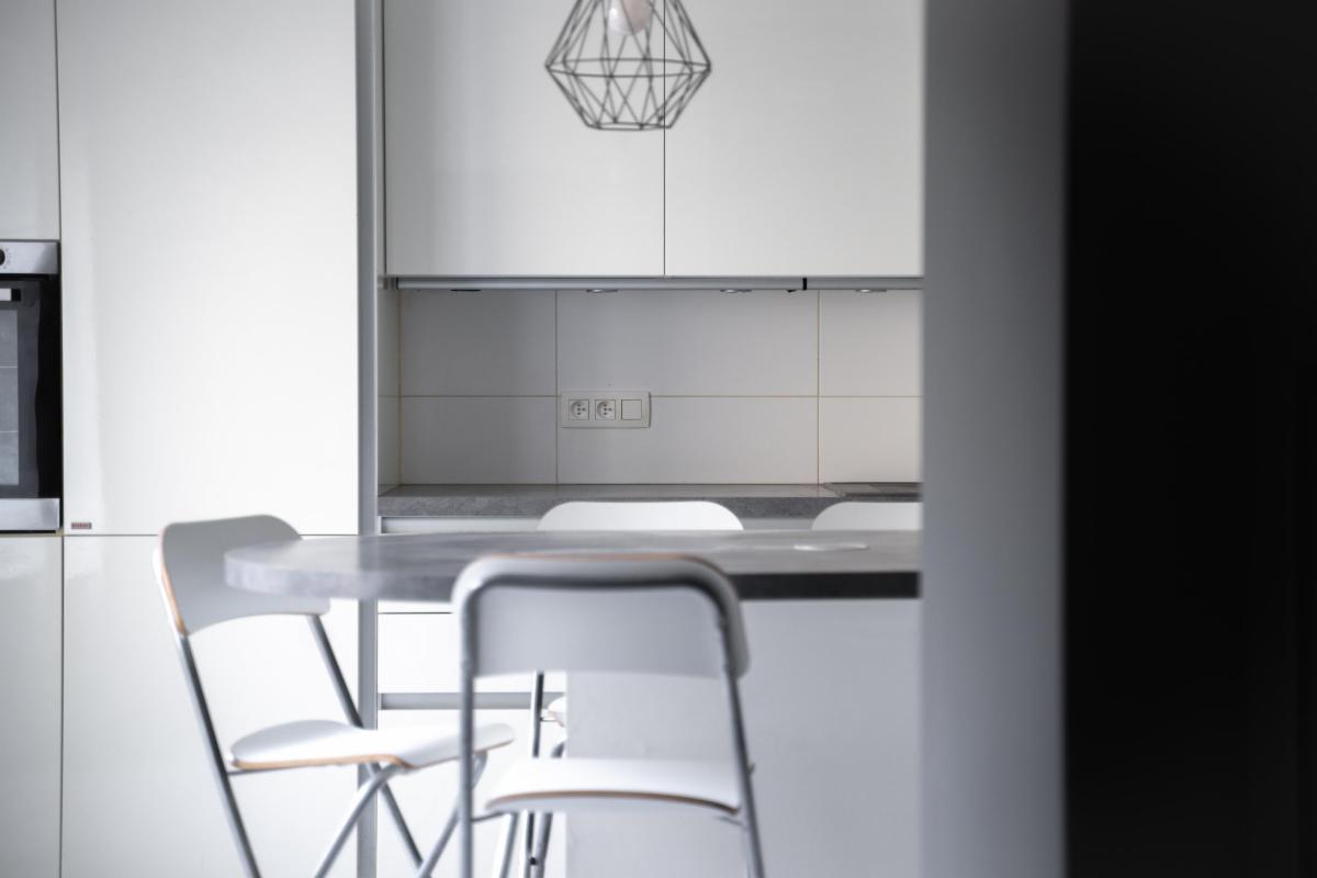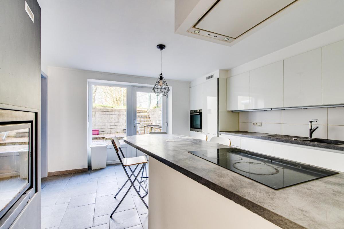 Une cuisine moderne avec accès à une cour extérieure et au jardin