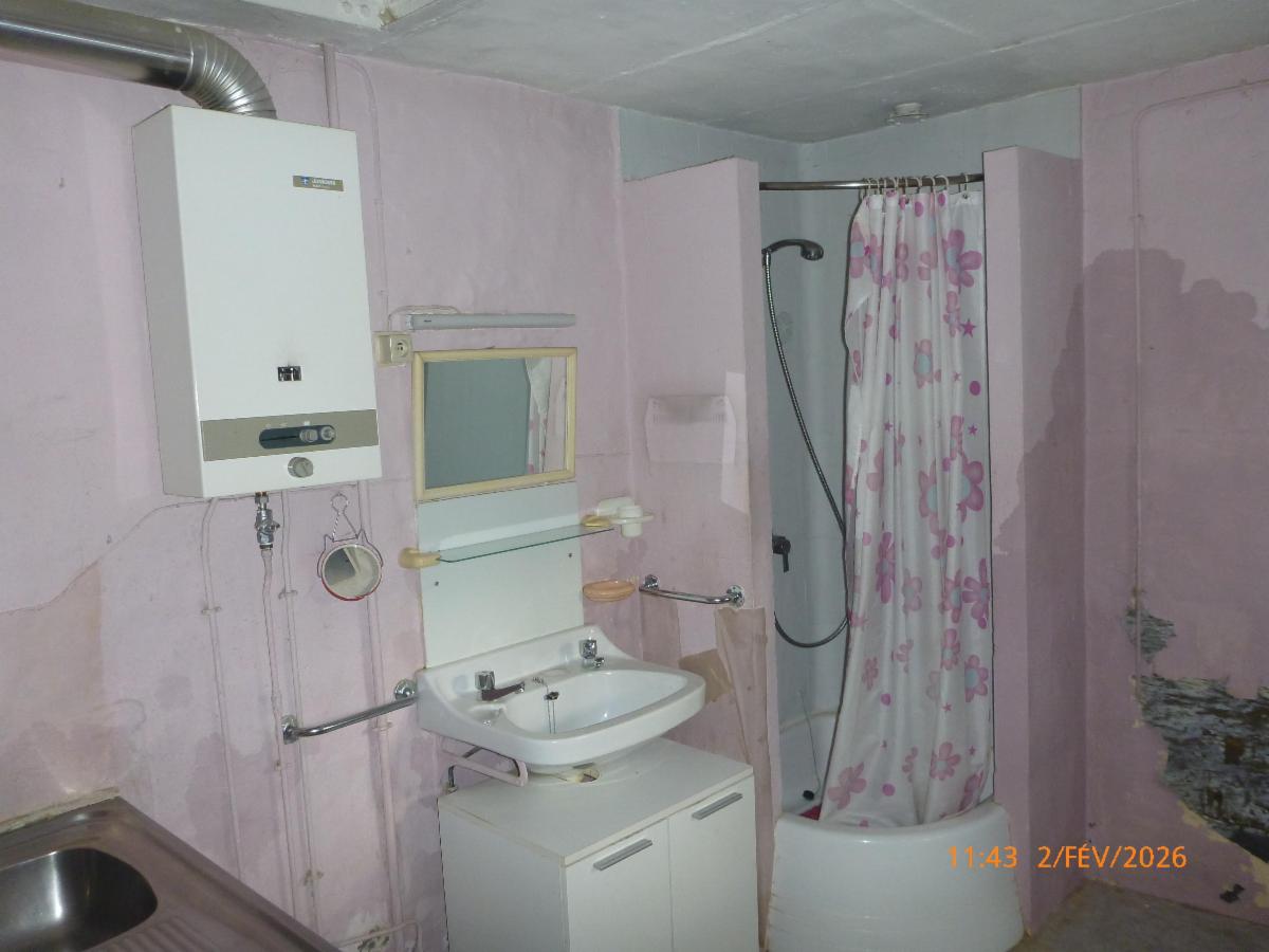 -Rez : un salon, une salle à manger, une salle de douche (WC, douche, évier) et une cuisine non-équipée.