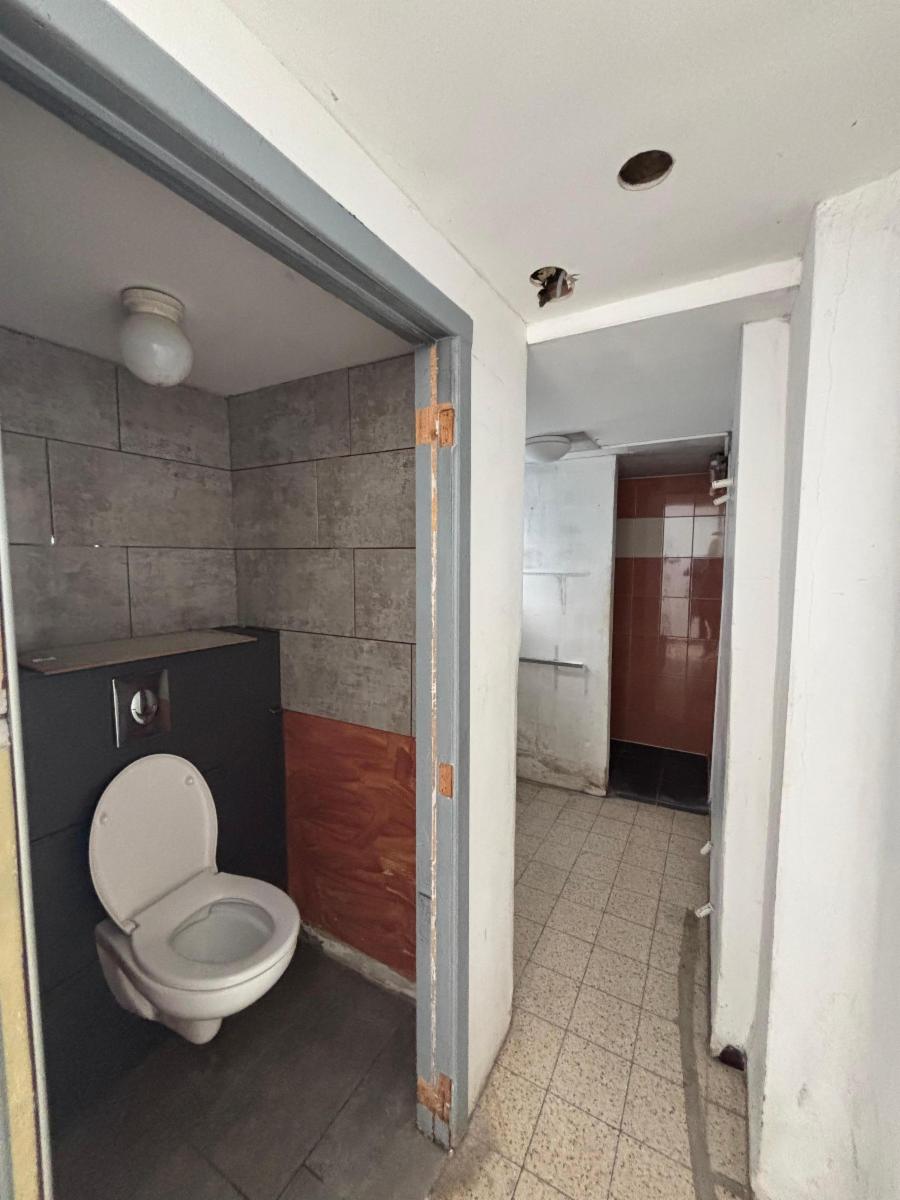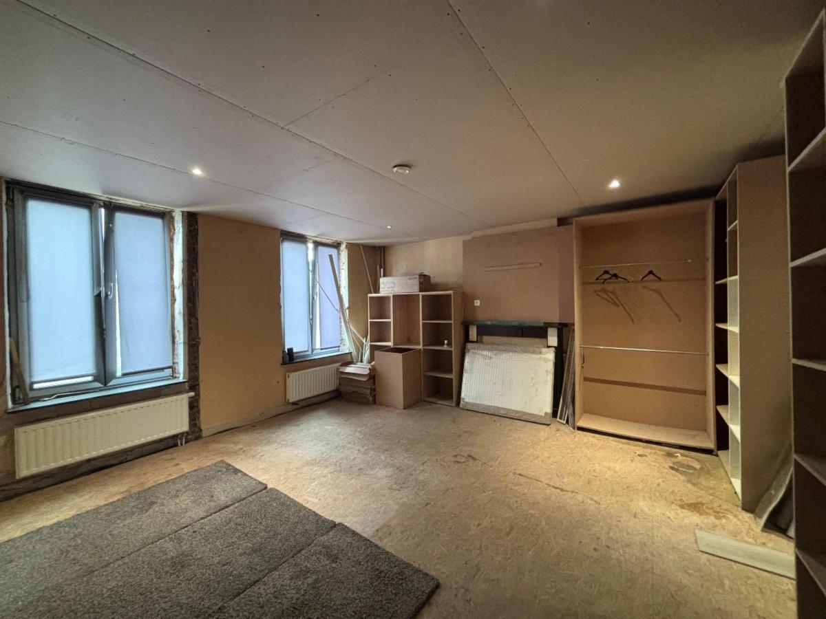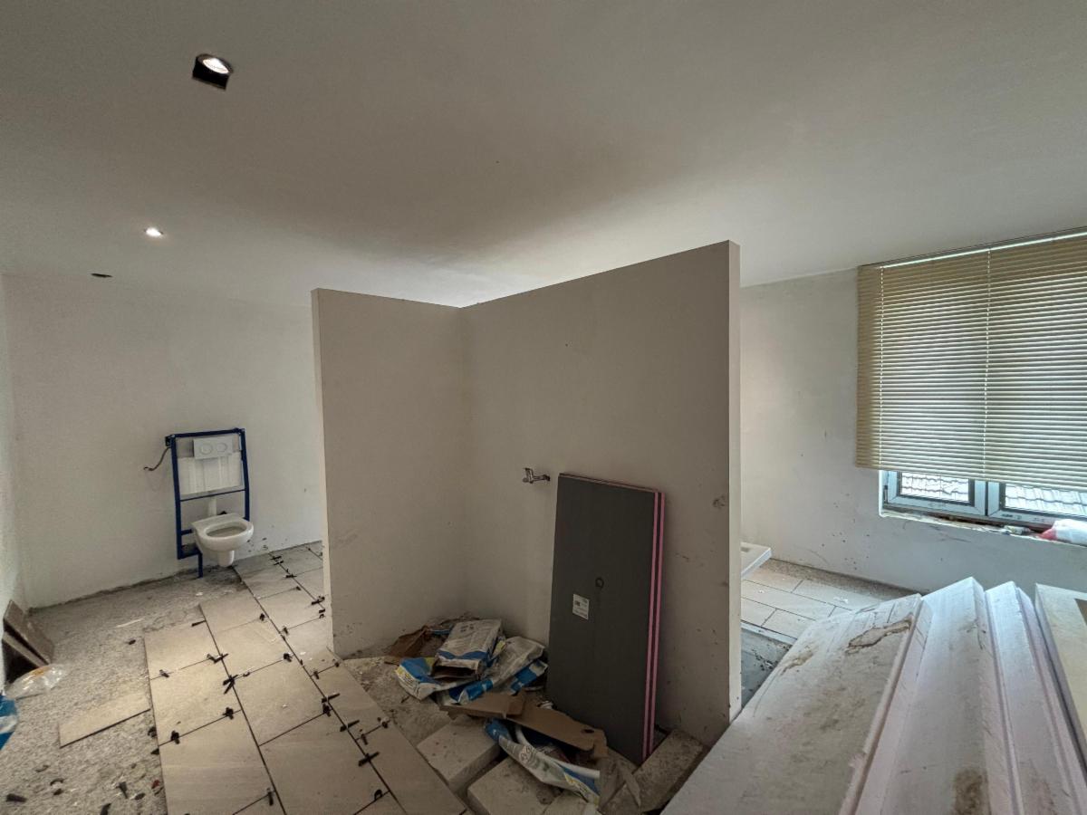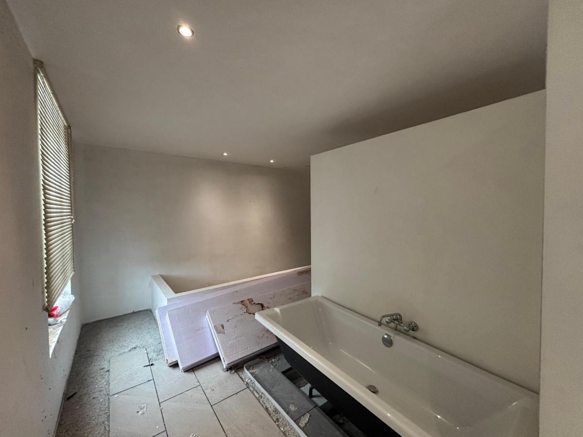 Premier étage : salle de bain en travaux et une grande pièce.