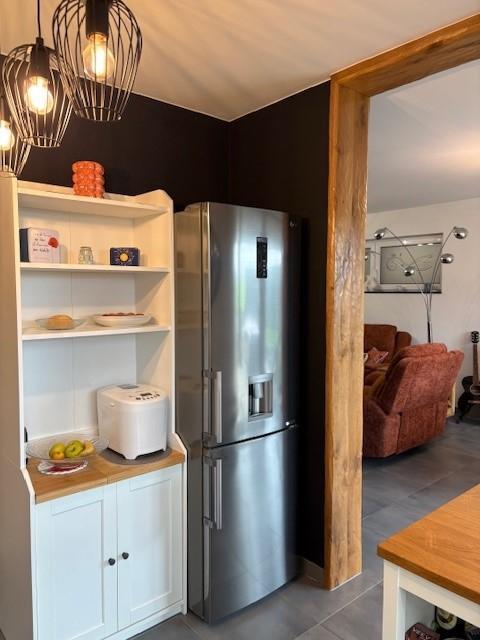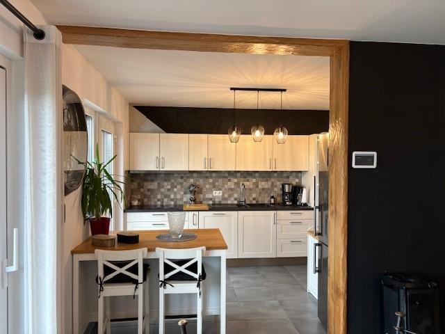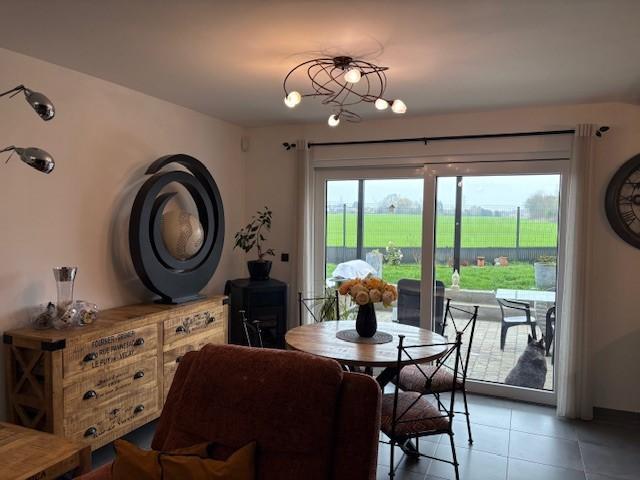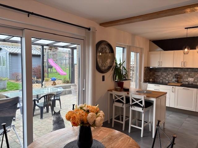REZ :hall d’entrée, wc séparé, salon, salle à manger, cuisine équipée, terrasse avec pergola, petit jardinet, abri de jardin, garage