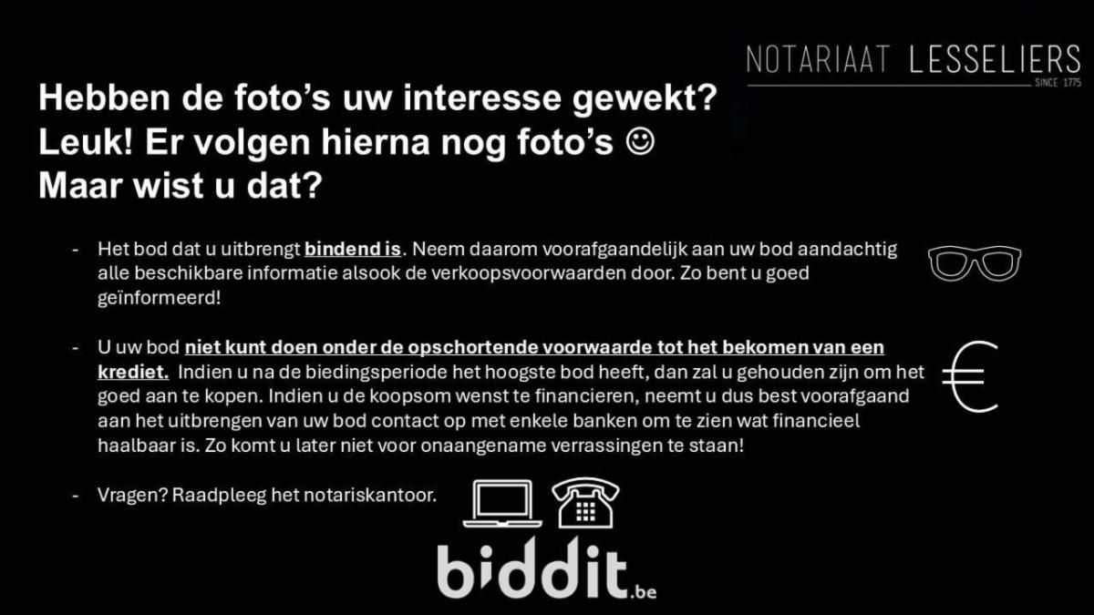 Voir la fiche sur Biddit.beHet goed zal door de kandidaat-kopers kunnen bezocht worden elke donderdag van 12u-15u, en dit vanaf donderdag 2 april 2026 tot en met donderdag 30 april 2026
