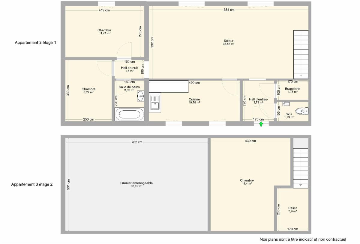 • Appartement 3 : hall d’entrée, WC, buanderie, vaste séjour, cuisine équipée, deux chambres, salle de bains ; à l’étage, possibilité d’aménager une troisième chambre et présence d’un grand espace aménageable.