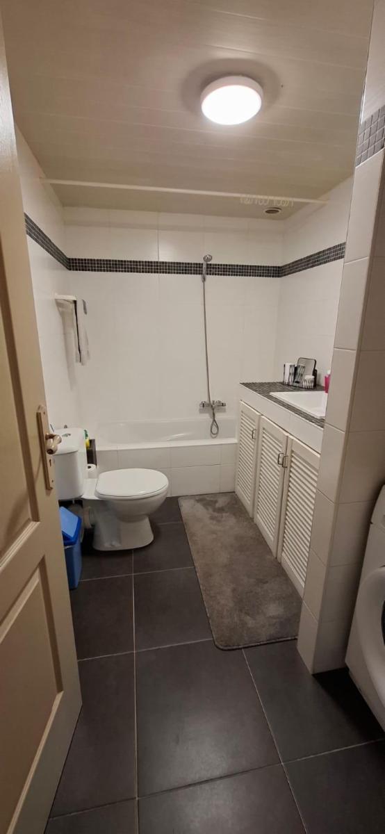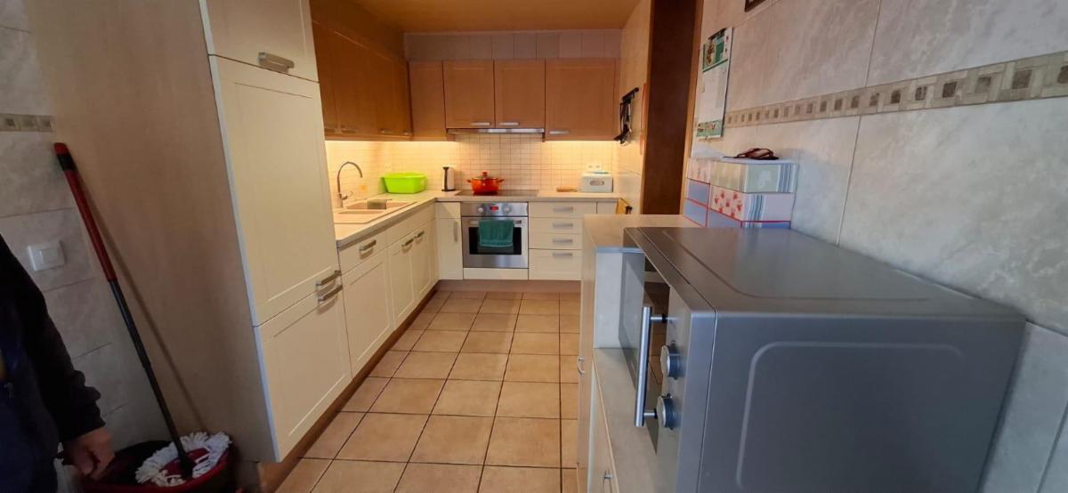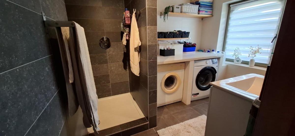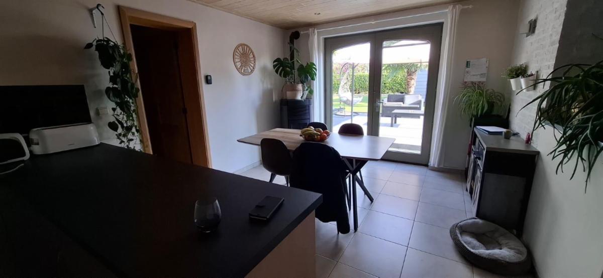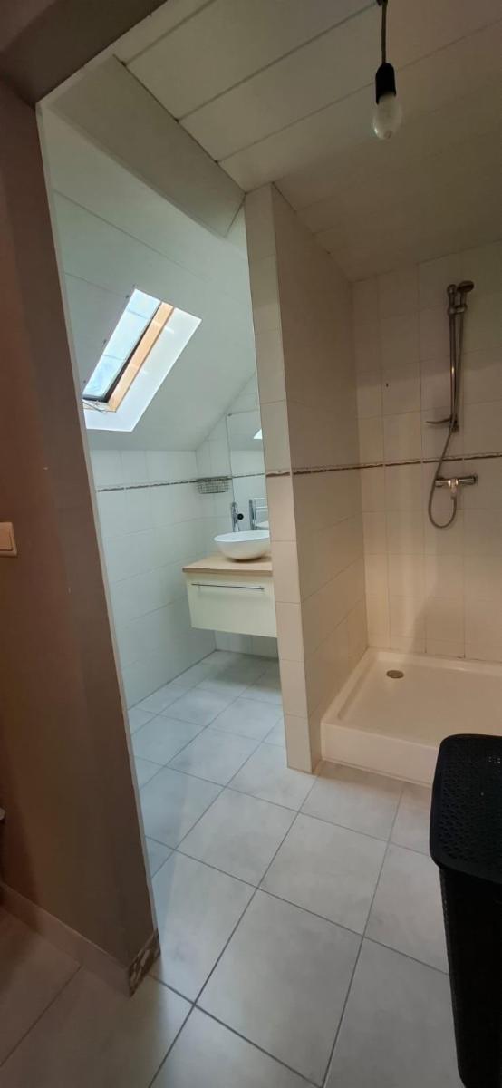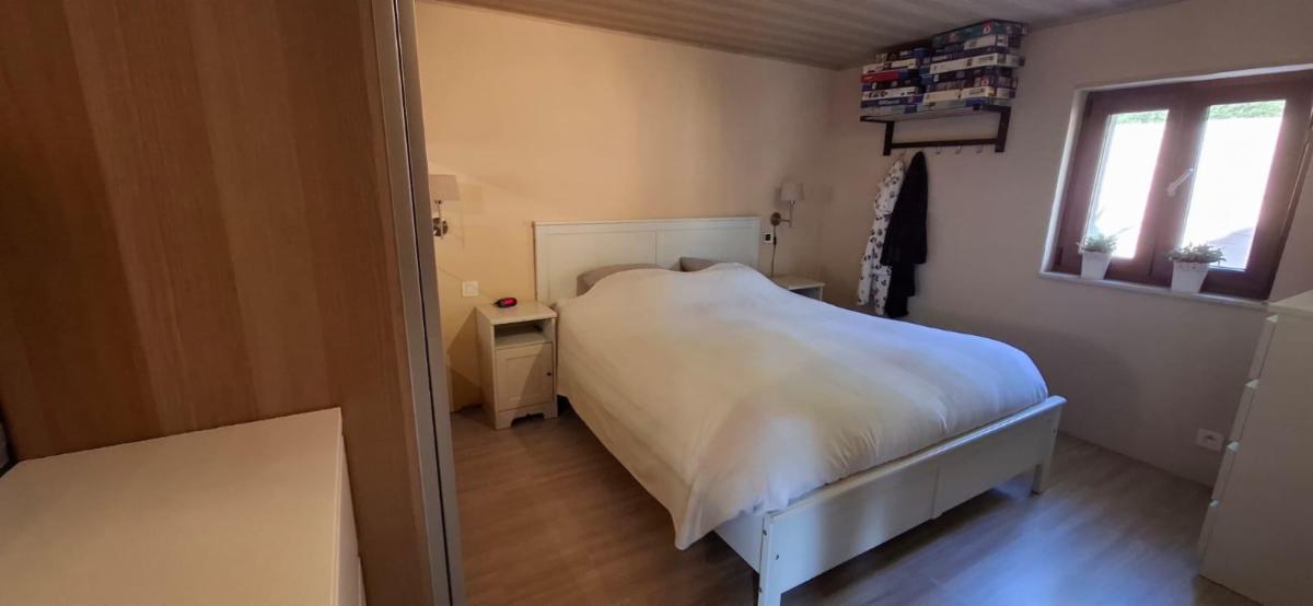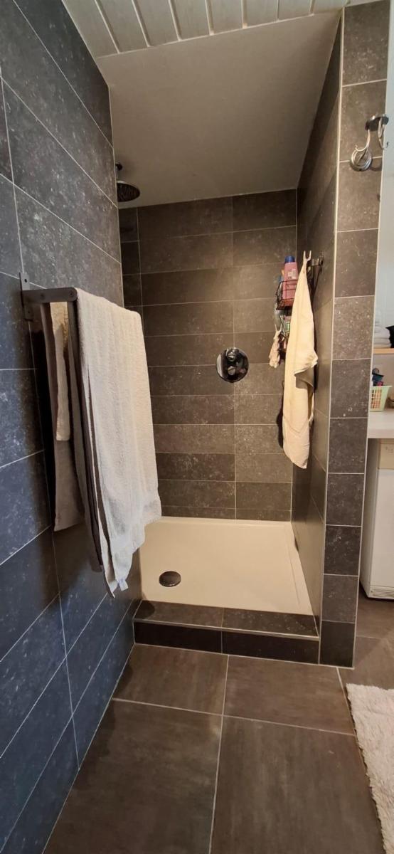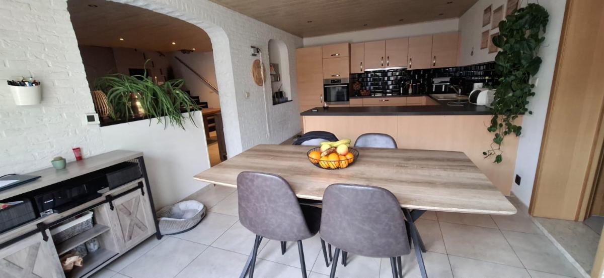 Rez-de-chaussée : salon, cuisine équipée ouverte sur la salle à manger, salle de douche.