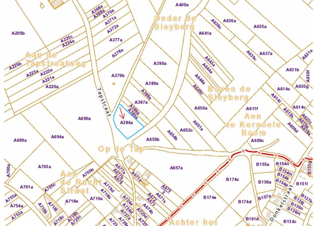 Het perceel gelegen te Tongeren (Lauw) aan de Tapstraat, ter plaatse genaamd 'Onder de Sleyberg' (sectie A nummer 384A), is verpacht. De verkoop geschiedt ONDER DE OPSCHORTENDE VOORWAARDE VAN NIET-UITOEFENING VAN HET RECHT VAN VOORKOOP DOOR DE PACHTER.