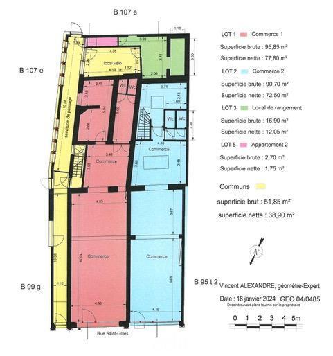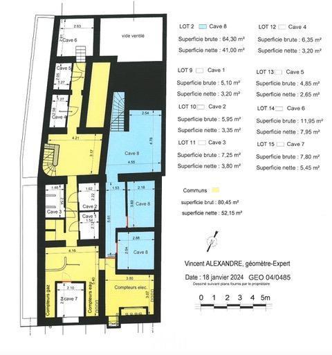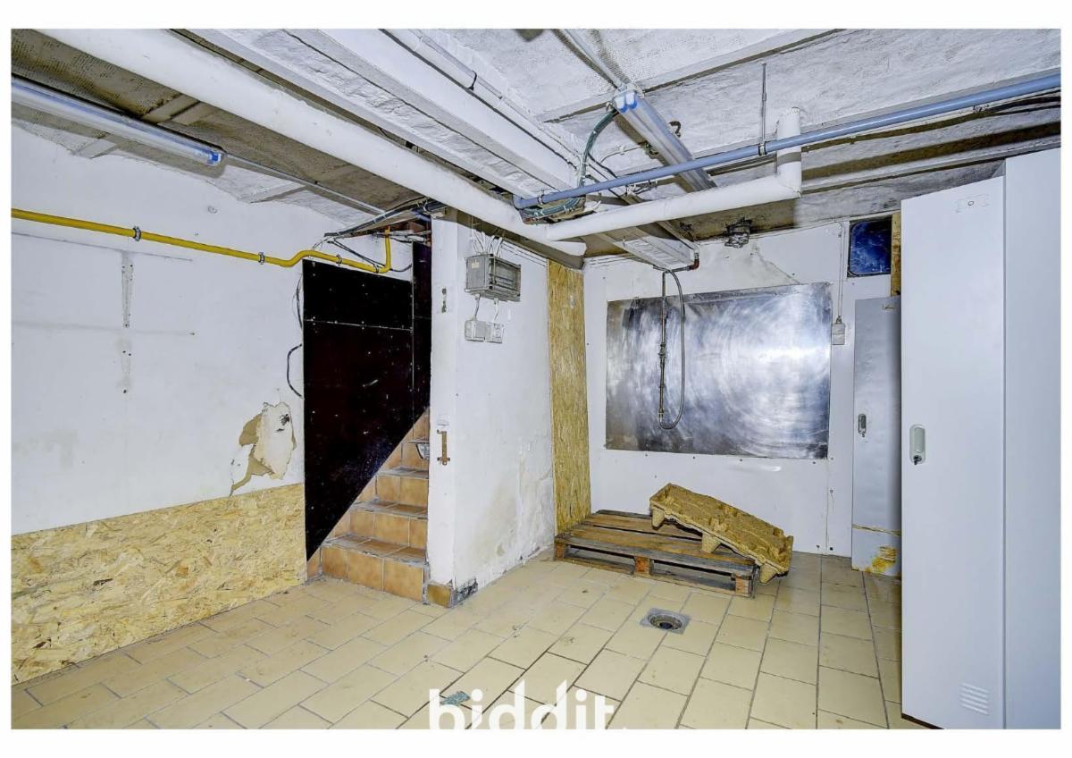 Le bien fait partie d’un immeuble à usage mixte et se compose d’une surface commerciale principale, avec une arrière-boutique, un espace de stockage et des sanitaires ainsi que 3 caves situé au sous-sol (sur les plans : lot bleu).