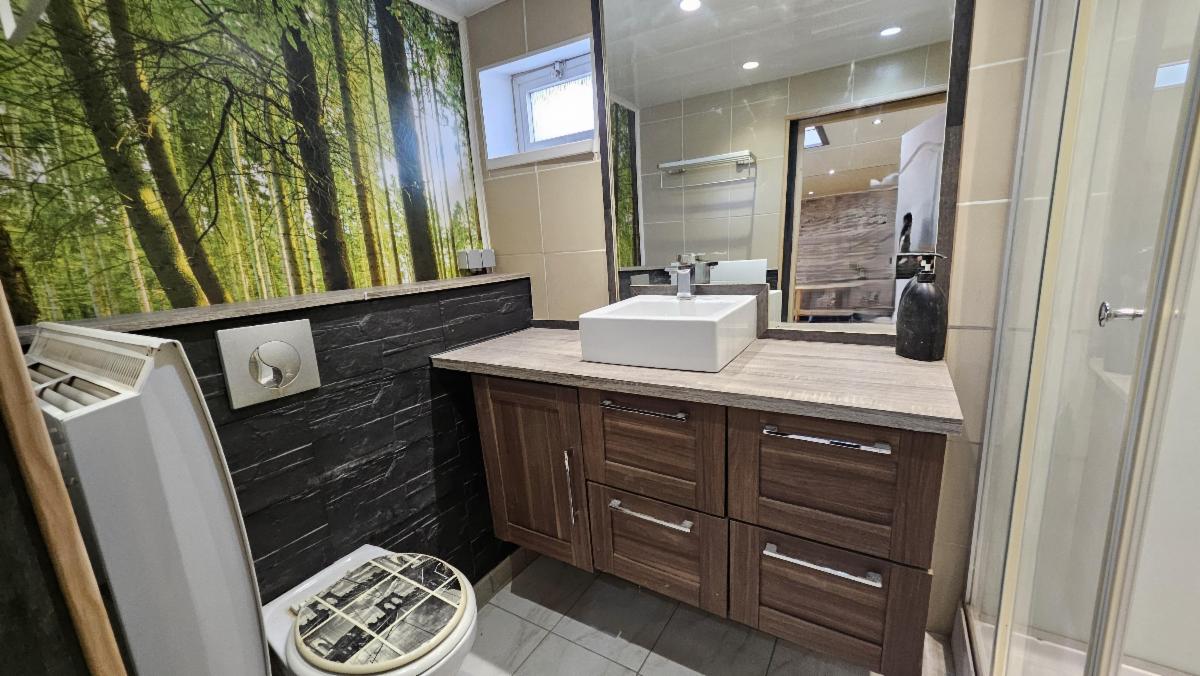 - Au Rez-de-Chaussée : Un couloir desservant une pièce de vie spacieuse, Une pièce avant séparée par l'escalier vers l'étage et un espace de rangement, une cuisine ouverte avec taquez au gaz, évier, four et micro-onde et lave-vaisselle. Une salle de bain avec chauffe eau, WC, lavabo et douche et chauffage électrique. Le tout chauffé par un convecteur au gaz. en extérieur un jardin avec terrasse en pierre, et chalet de jardin. Sur l'arrière, énorme espace parking avec accès vers la rue de la grotte.