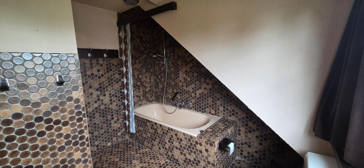 1er ETAGE sur charpente bois – tapis au sol : un hall de nuit de 8,59 m² (4,77*1,80) – trois chambres de 15,42 (4,99*3,09) – 8,56 (2,90*2,95) et de 7,84 m² (2,77*2,44 + 1m²) – une salle de bain, composée d’une baignoire, d’un lavabo double et d’un WC, de 7,67 m² (2,82*2,72)