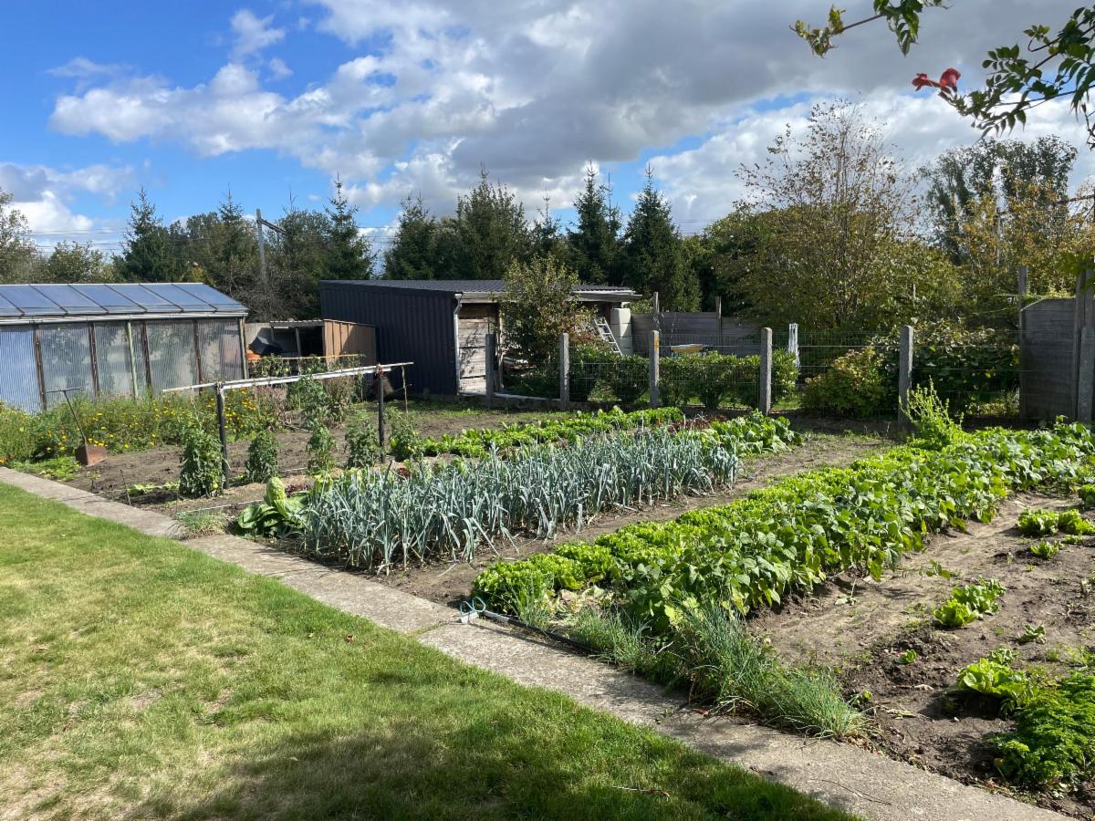 À l’extérieur : jardin, potager avec serre et cubis pour réception d’eau de pluie, terrasse, espace barbecue couvert avec hotte et four à pizza.