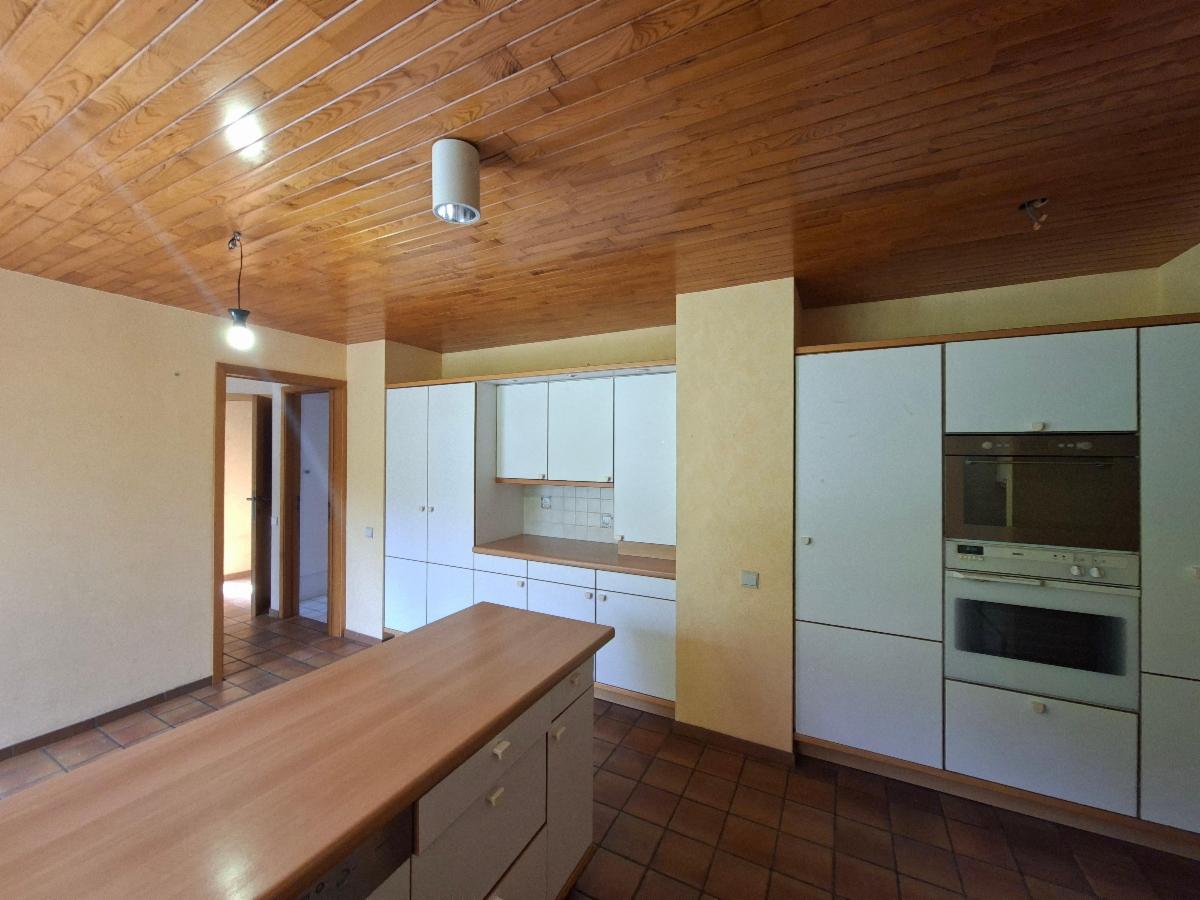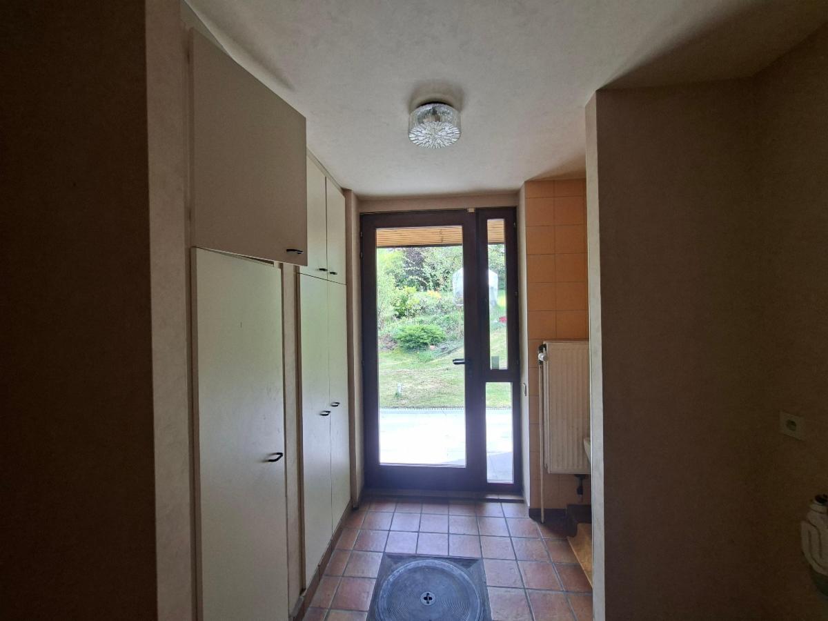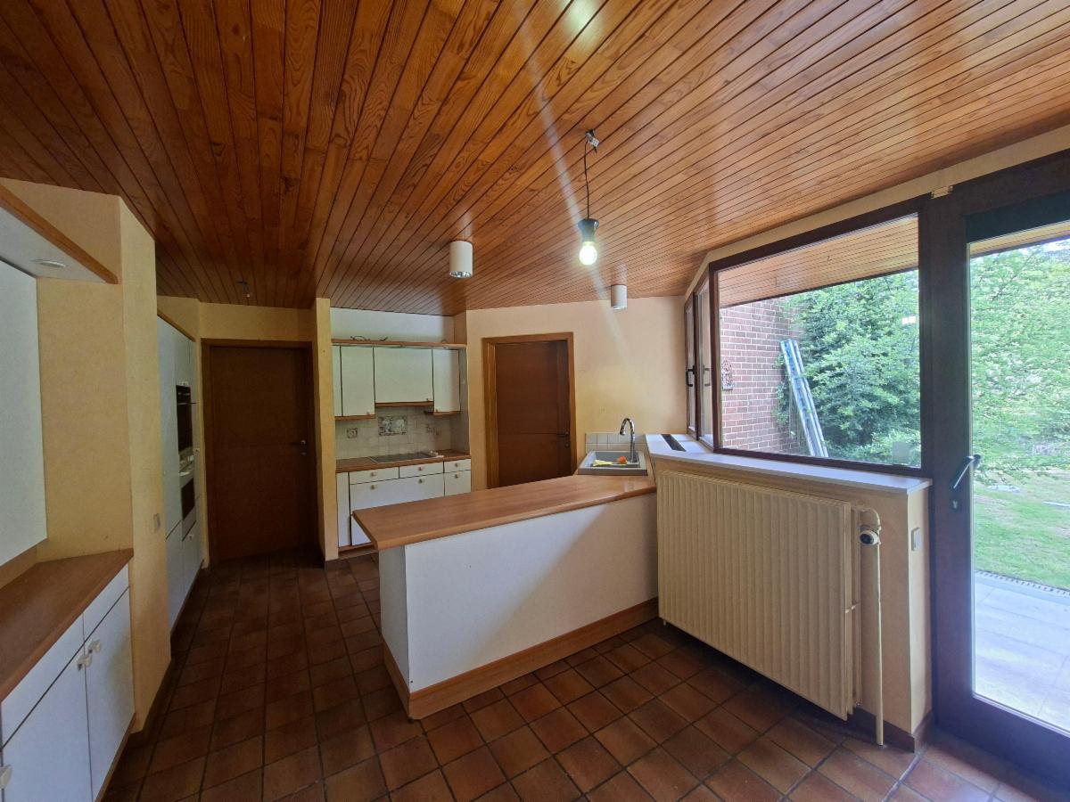 Rez-de-chaussée: Hall d'entrée avec vestiaire, spacieux living avec insert au bois et baie vitrée donnant accès à la terrasse, grande cuisine entièrement équipée (double évier, lave-vaisselle, micro-ondes, four), une salle de bain avec baignoire, une chambre avec placard, wc individuel, bureau.