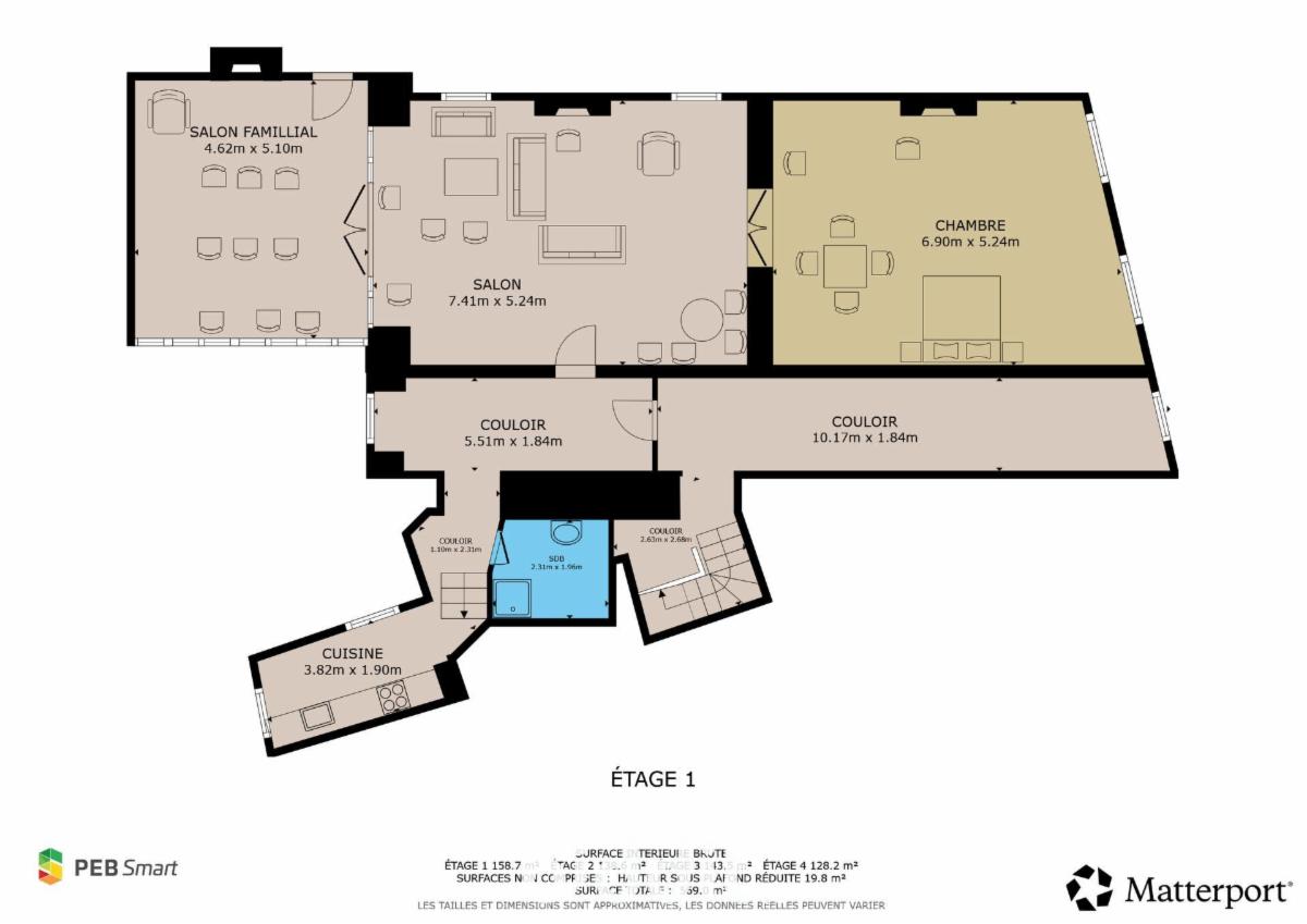 1er étage : Séjour, grande chambre, cuisine, sdb.