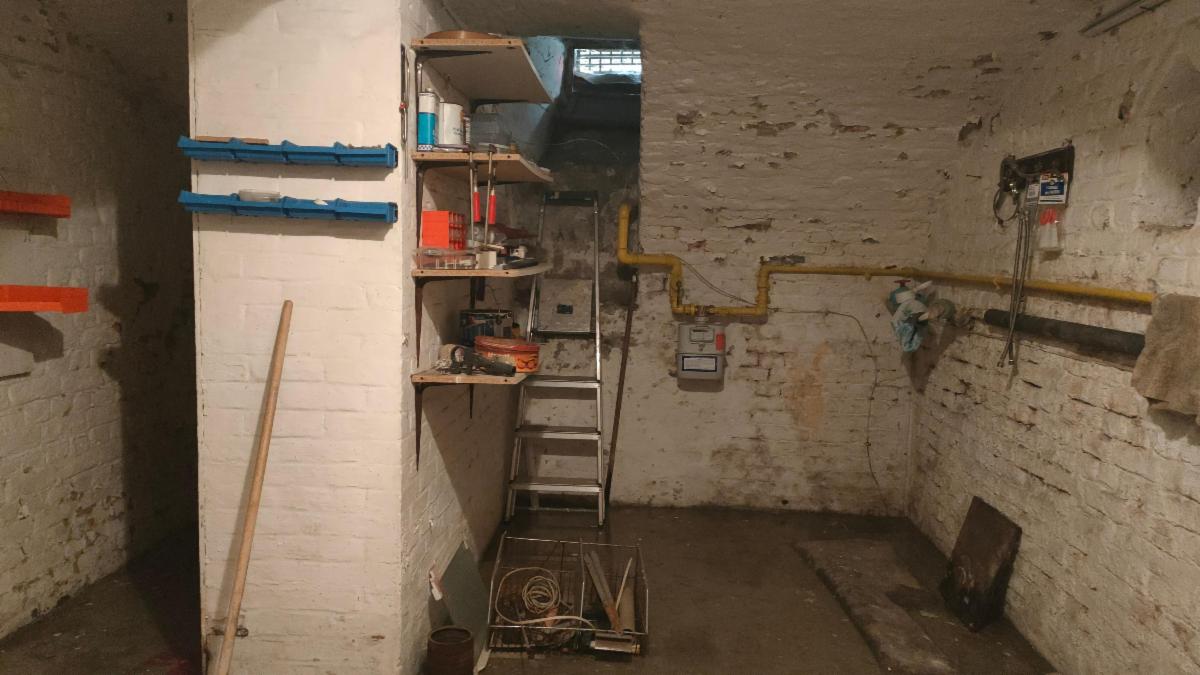 Rez-de-chaussée : hall, living, cuisine, WC, cour avec remise et jardinet.