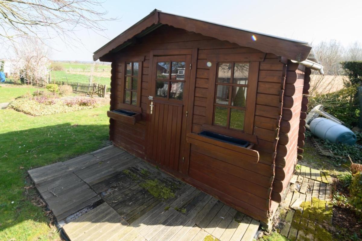 À l’extérieur : une terrasse, un jardin avec tilleul, une pelouse et un chalet de jardin.