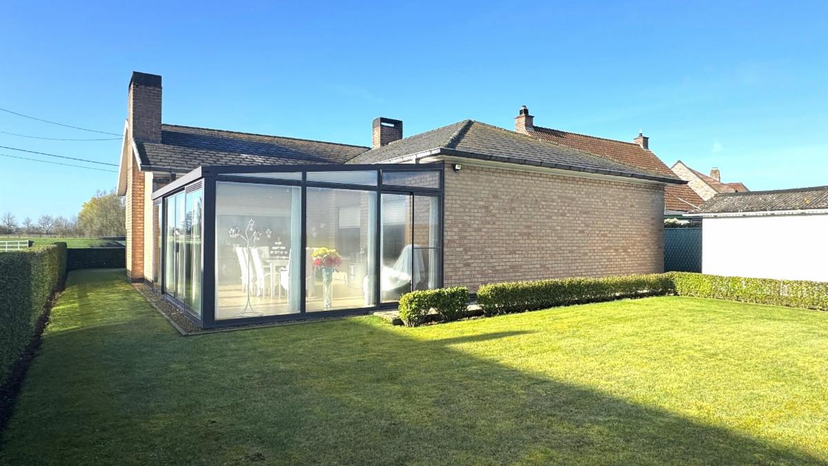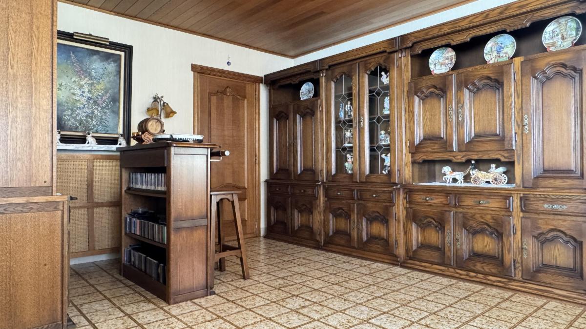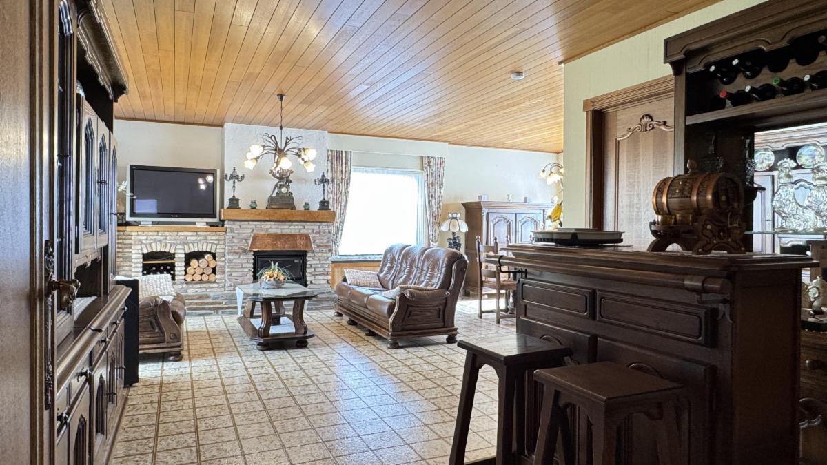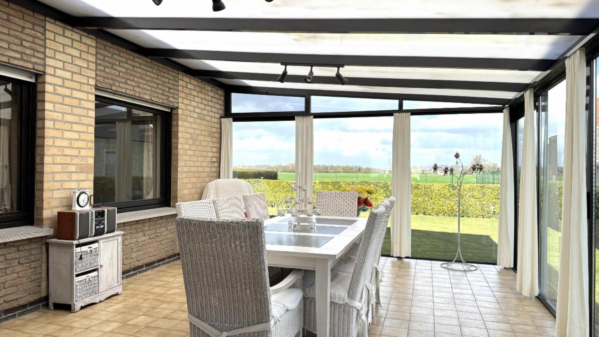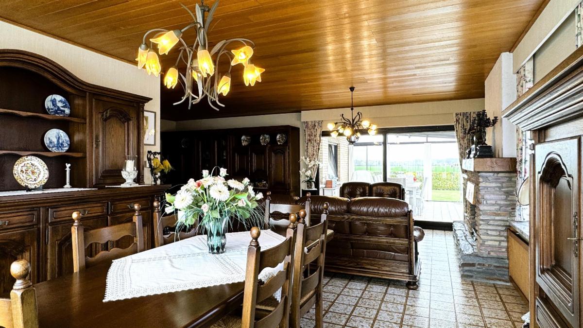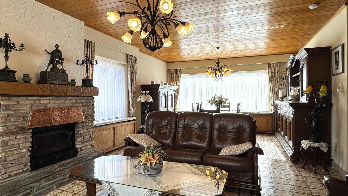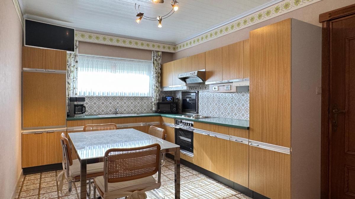 Ruime living met eet-en zithoek (cassette op hout), veranda, geïnstalleerde keuken met eethoek.
