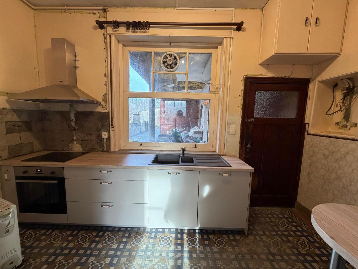 Le rez-de-chaussée est composé d'un hall d'entrée, à gauche il y a une pièce de vie avec feu mazout et à droite une autre pièce de vie, d'une cuisine équipée (évier, micro-ondes, four, taque électrique, hotte, frigo et congélateur), d'une salle de douche (avec évier, douche et WC) et d'une buanderie.