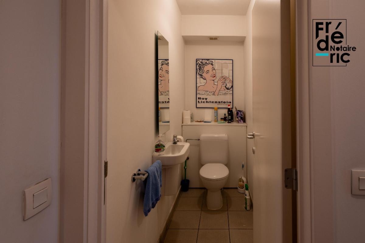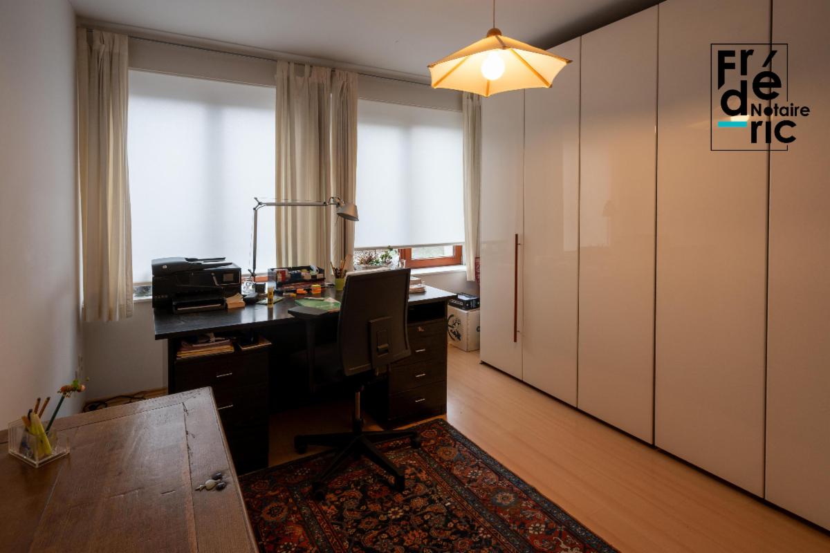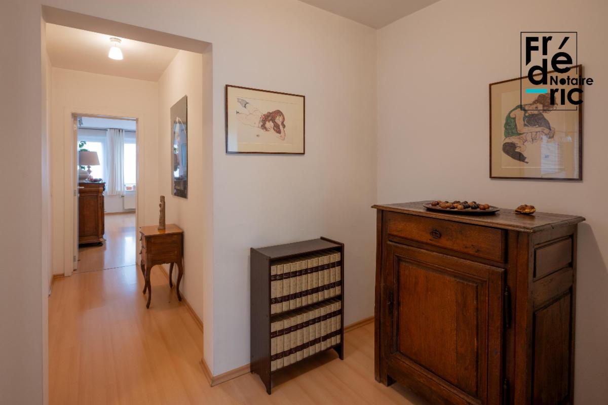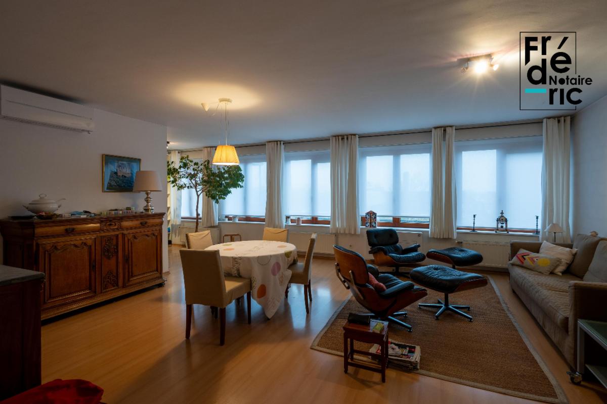 Un grand living de 35m² s'ouvre dès l'entrée de l'appartement, après le passage d'une petit vestibule et débarras. Il est très lumineux grâce à ses 5 grandes fenêtres. La cuisine équipée communique sans porte avec le living. La seconde partie de l'appartement est composée du hall de nuit, toilette, salle de douche et chaufferie. Au bout de celui-ci, on accède aux deux chambres qui se trouvent sur la façade opposée de l'immeuble. Le bien dispose d'une chaudière gaz individuelle qui alimente un chauffage central, ainsi que de la climatisation.