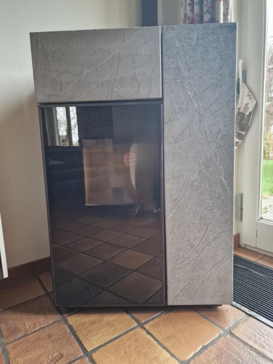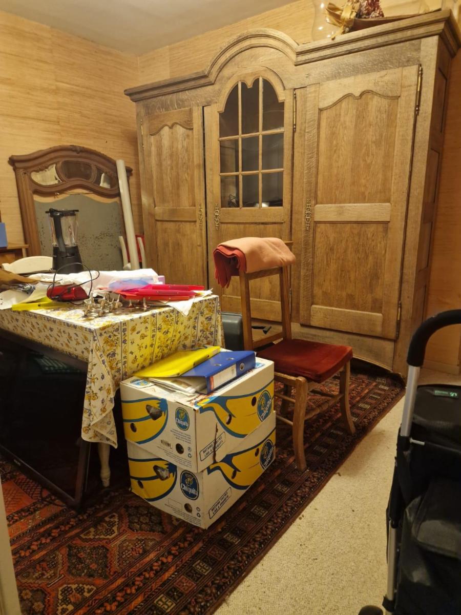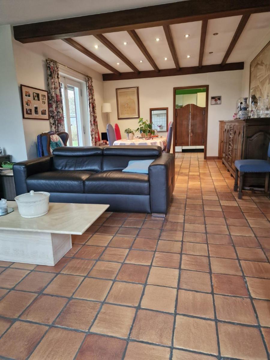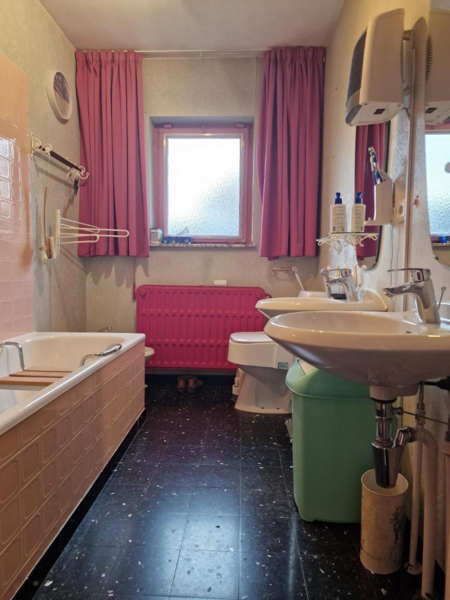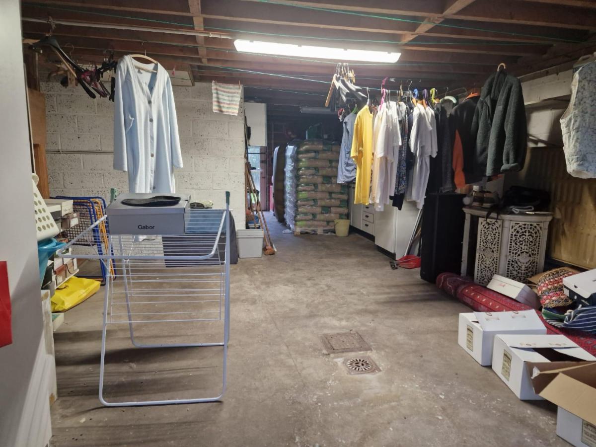 Salon avec poêle à pellets, salle à manger, cuisine, deux débarras, deux chambre à coucher (éventuellement 3), une salle de bains avec WC, un WC indépendant, un bureau ( ou 3ème chambre) et une pièce de rangement.