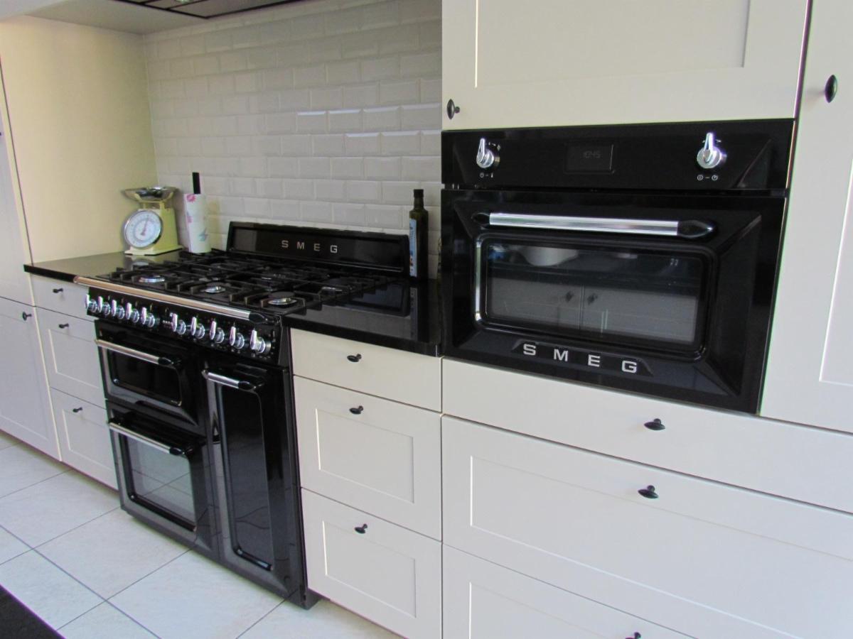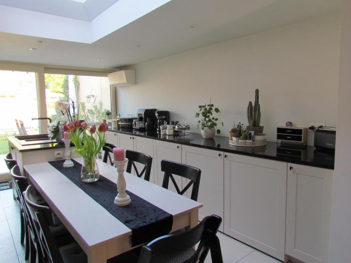 Beneden: inkomhall met toiletruimte; vestiaire met ingemaakte kasten op maat, leefruimte met inbouwhaard (op gas), kasten op maat, welke leefruimte overvloeit naar de moderne landelijke keuken met iconisch SMEG-fornuis en inbouwtoestellen en natuurstenen werkblad, alsook een esthetisch ingewerkte ruimte voor wasmachine en droogkast. Alle kasten zijn op maat gemaakt en uiterst kwalitatief.