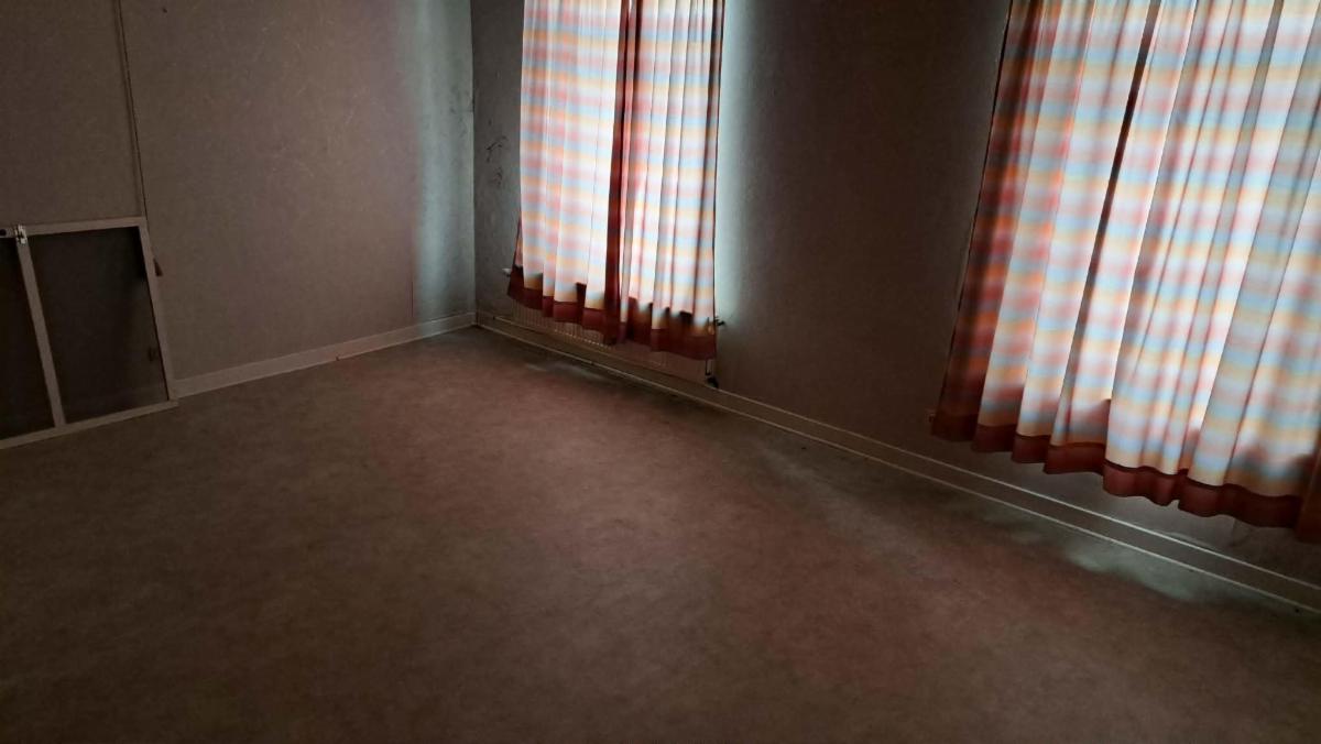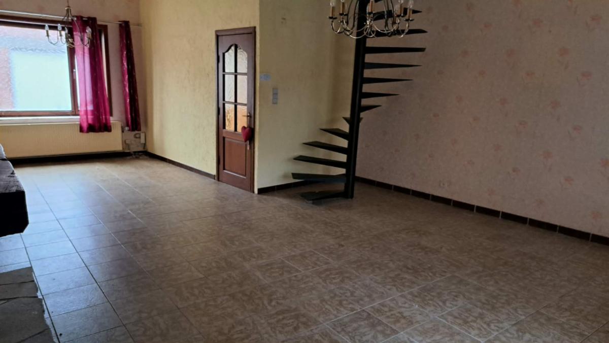 Maison 3 façades se composant au rez: hall d'entrée, beau living, véranda, grande cuisine équipée, salle de bains (douche, évier, wc), buanderie; à l'étage: 2 chambres. Grenier aménageable (accès par escalier). Jardin avec terrasse. Chauffage central gaz. Châssis DV en PVC et en bois. Raccordement à l'égout. Libre d'occupation. Superficie selon mesurage (lot n°1 du plan) : 499,55 m² - Revenu cadastral : +/-393 €