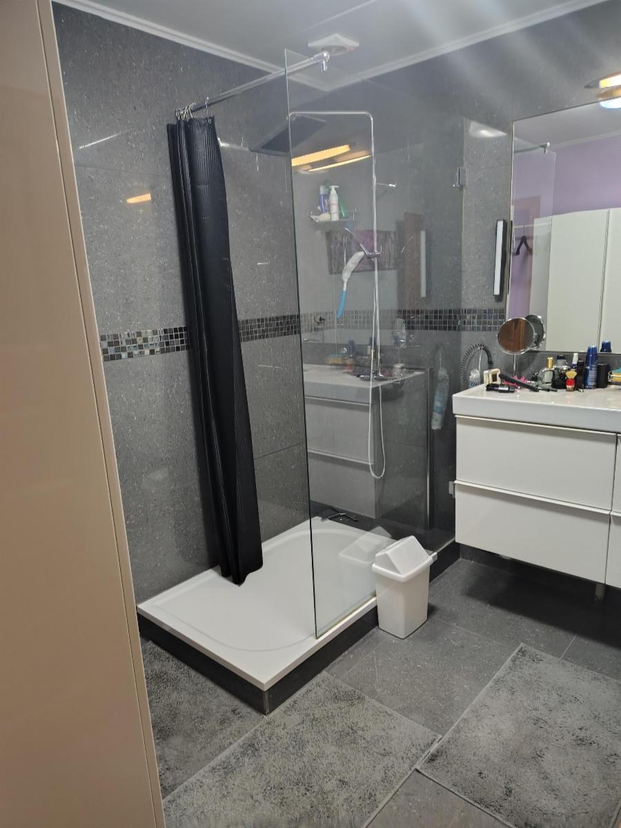 Une salle de bain moderne avec douche à l’italienne (5,83 m²), WC séparé, un hall d’entrée (7,38 m²) ainsi qu’un hall de nuit (5,24 m²) complètent l’intérieur.