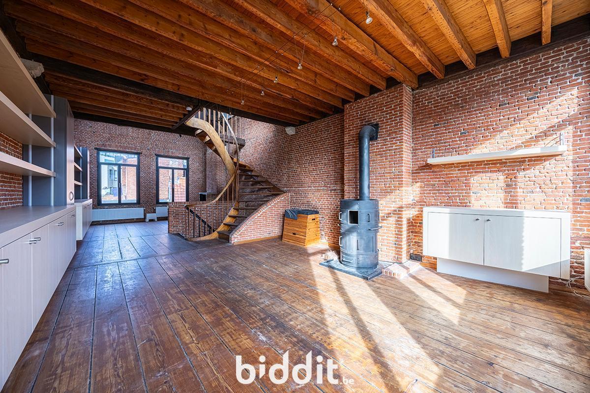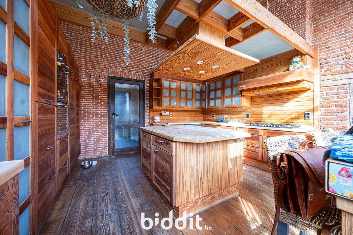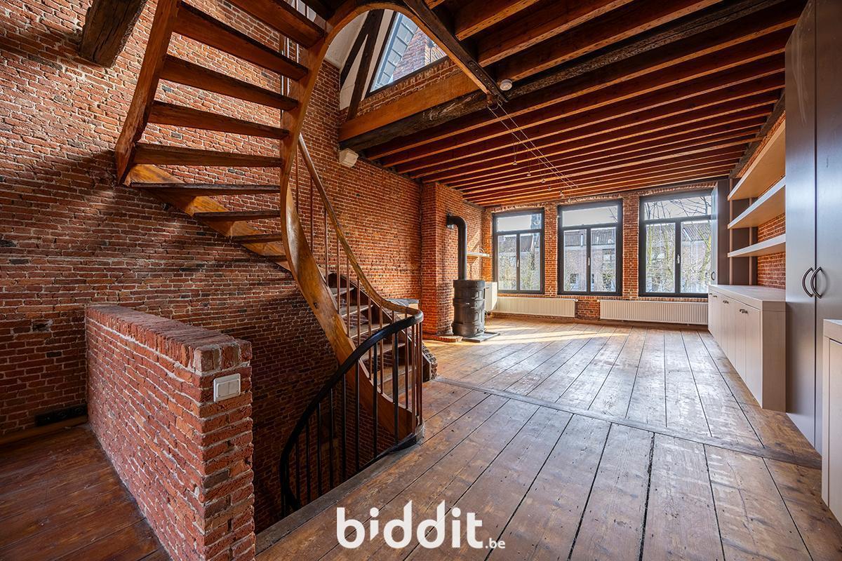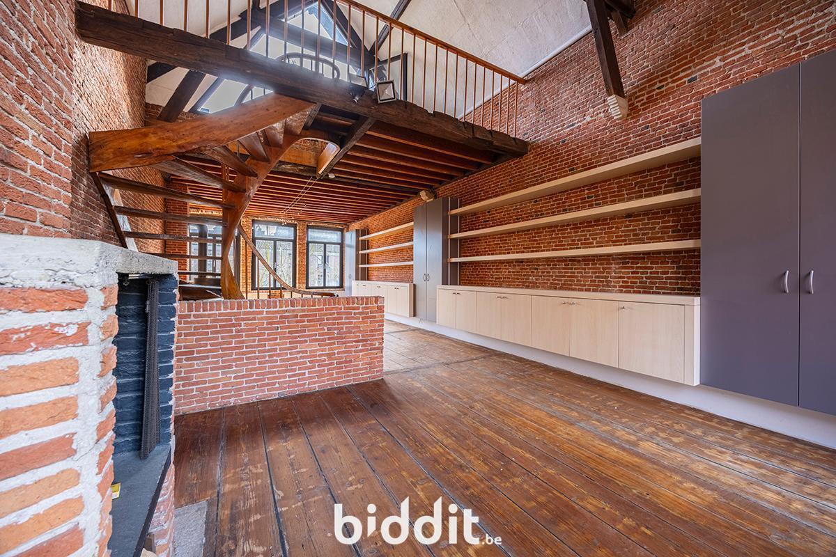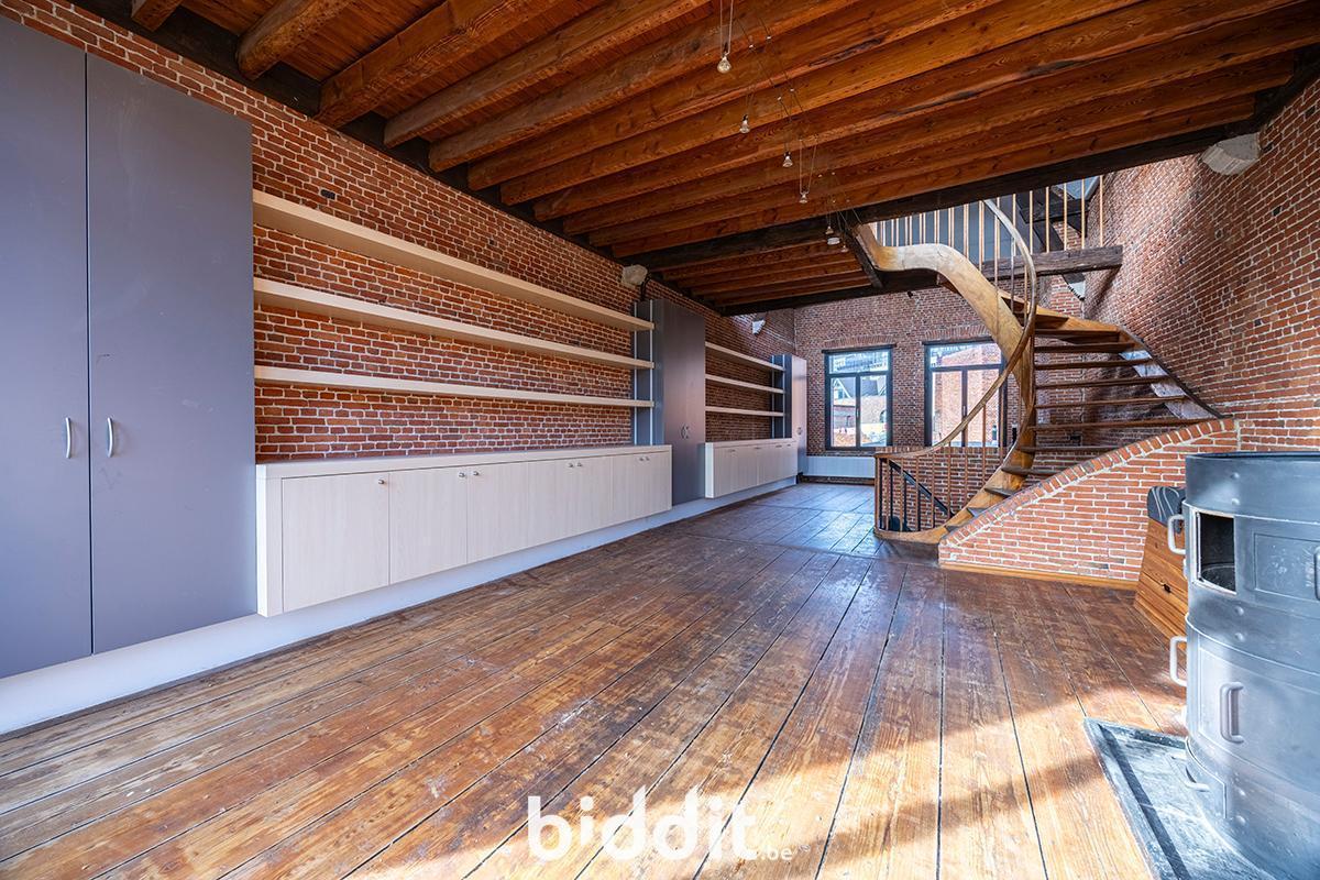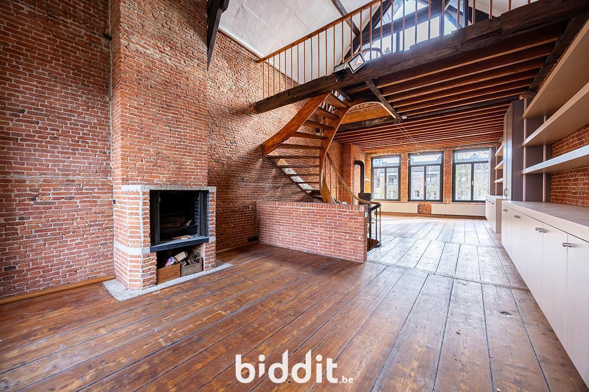 - Voorhuis: grote doorlopende lichtrijke leefruimte, vooraan zitgedeelte met gietijzeren houtkachel, achteraan eetruimte met traditionele schoorsteen met open haard, middenin houten draaitrap verder naar mezzanine