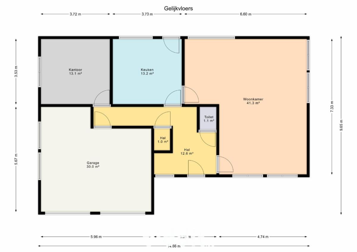 Inkomhall met trap en gastentoilet, zithoek met open haard, eetplaats, keuken, gang, bureau / slaapkamer.