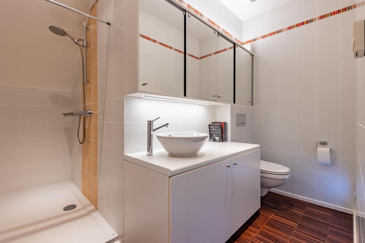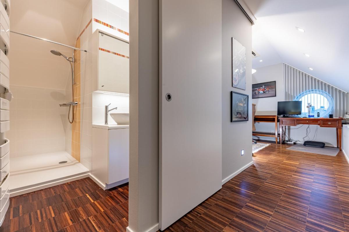 Le premier niveau accueille également la chambre principale, une salle de bain, un wc indépendant ainsi qu’un espace débarras/local technique parfaitement intégré. À l’étage, le duplex dévoile une magnifique pièce semi-ouverte accompagnée de sa salle d’eau et d’une chambre. Conçu comme un véritable espace « invités », ce niveau peut s’organiser en un élégant studio quasi indépendant comprenant salon ou bureau, chambre et salle d’eau, ou être aménagé en deux chambres distinctes.