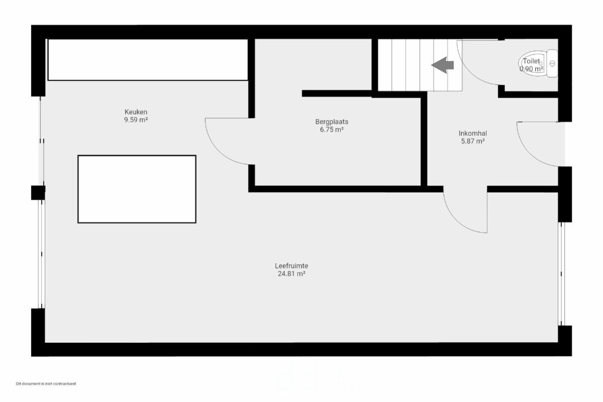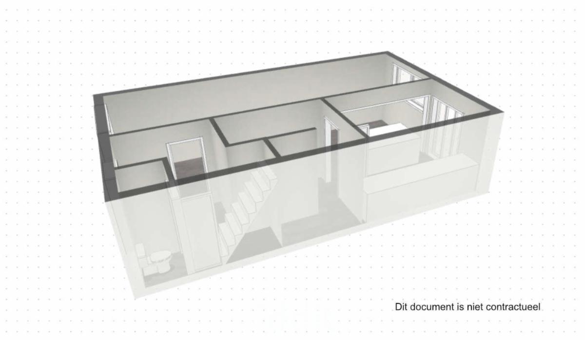 Gelijkvl.: inkomhal, afzonderlijk toilet, leefruimte en volledig ingerichte keuken.
