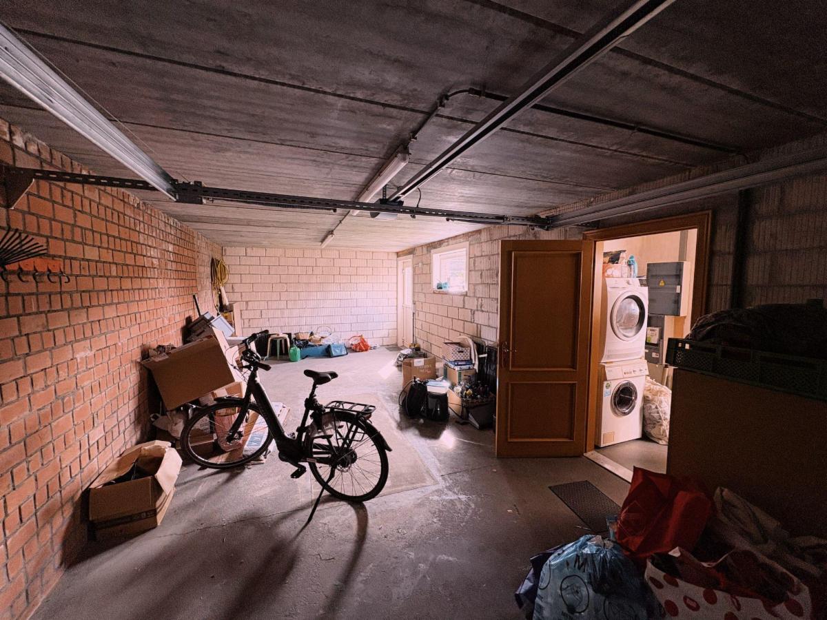 Ruime inkomhal met gastentoilet en bureau, lichtrijke leefruimte met zicht op de tuin en aansluitende keuken. Verder een wasplaats en inpandige garage.