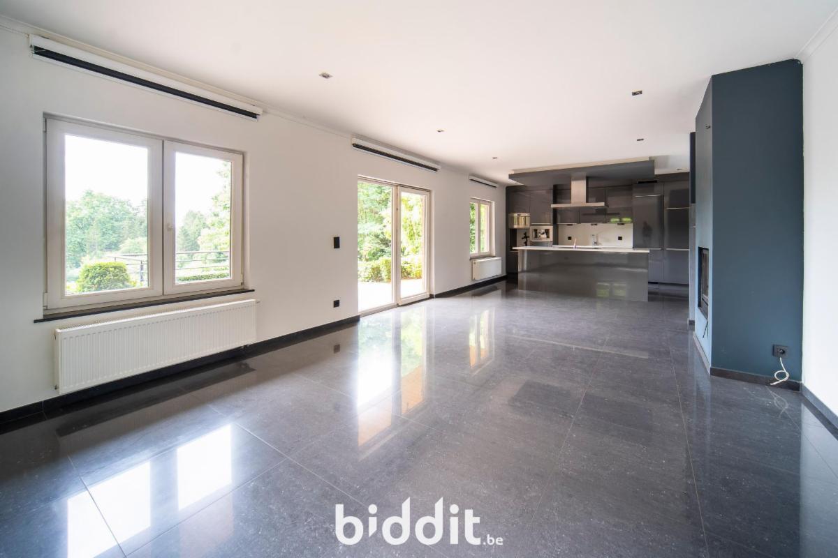 De grote raampartijen zorgen voor veel lichtinval en bieden directe toegang tot het terras met zicht op groen.