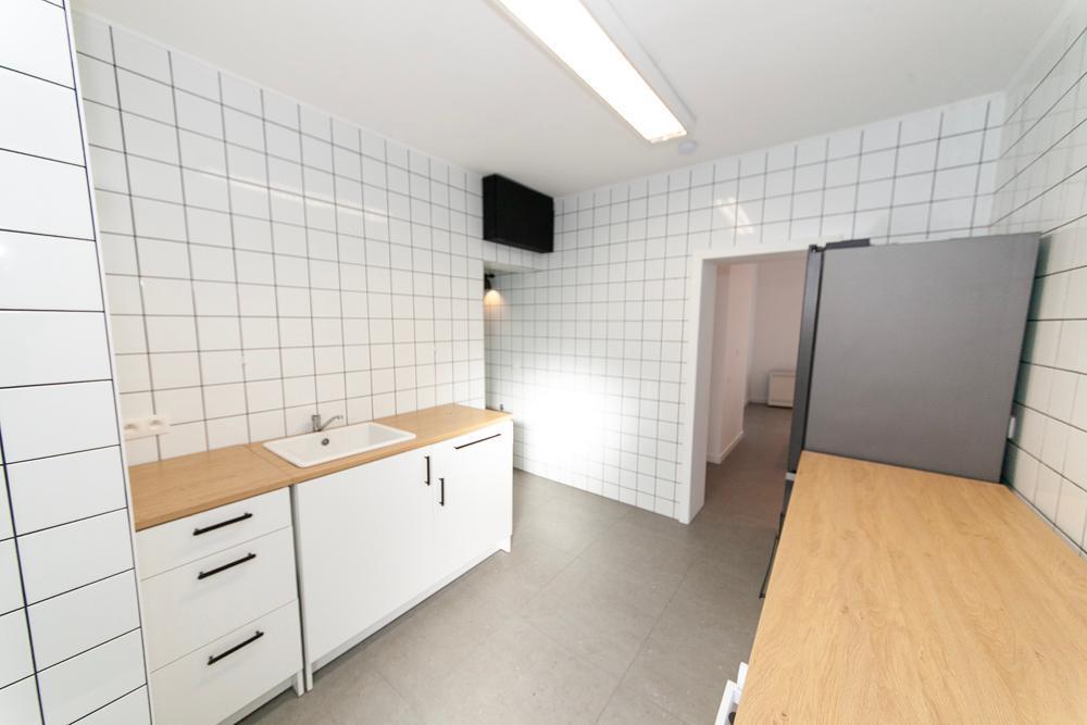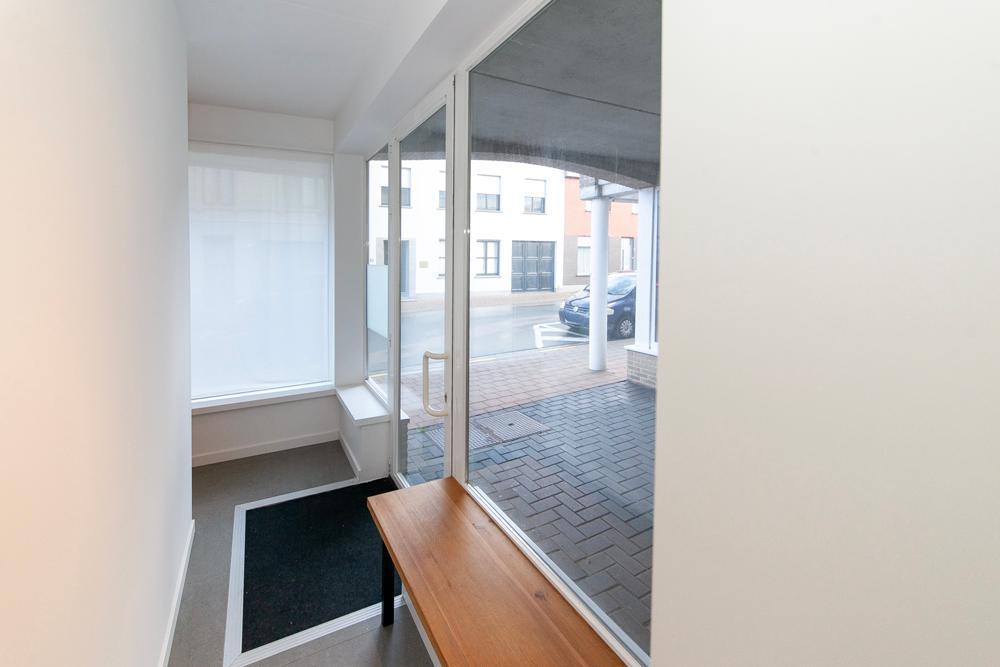 Via de eigen inkomhal met vestiaire betreedt u het gelijkvloerse appartement. Hier opent zich direct de ruime eetplaats (23 m²), perfect voor een grote eettafel. Aansluitend ligt de moderne, functionele keuken met koelkast, spoelbak en oven.