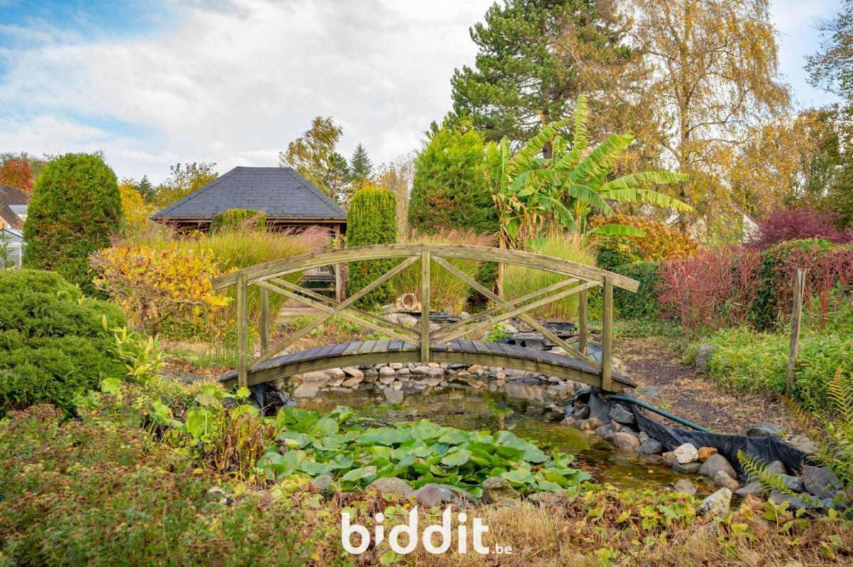 Buiten ontdekt u een mooi aangelegde tuin, een ware oase van charme en rust. Elk detail nodigt uit tot ontspanning. Eerst geniet je van een ruim overdekt terras, een elegante siervijver met stijlvolle overloopbrug en een sfeervol prieeltje.