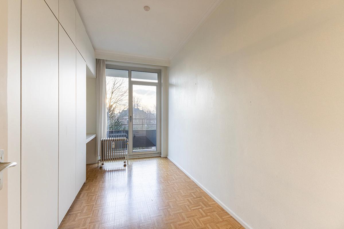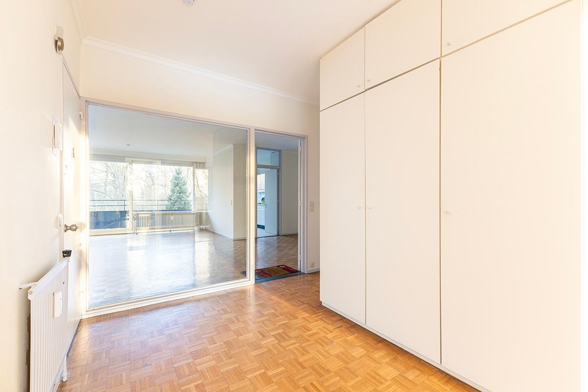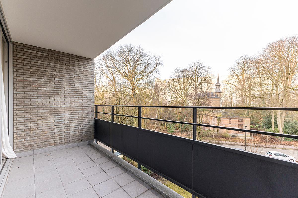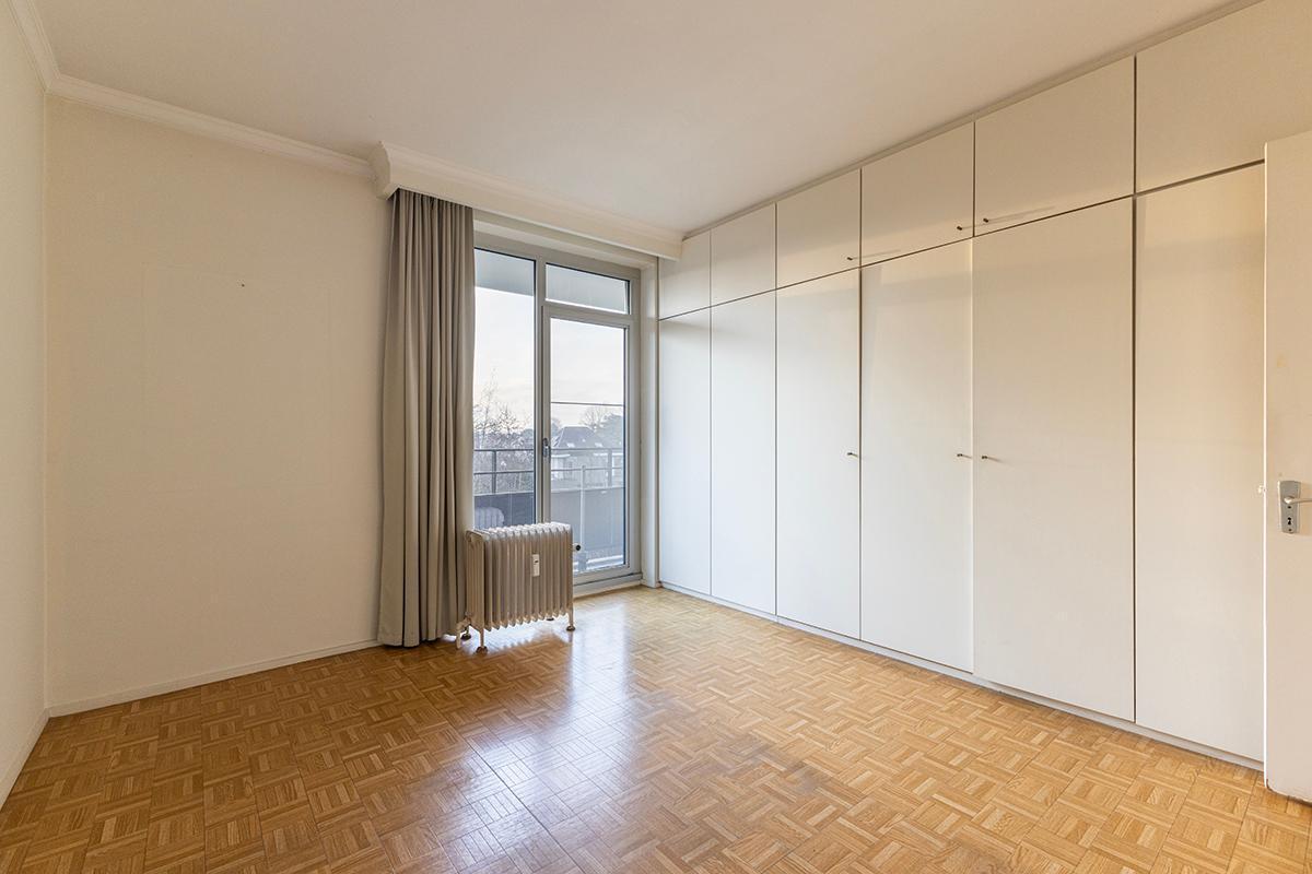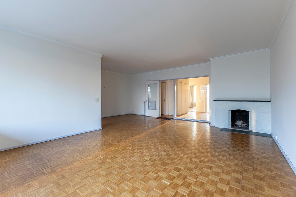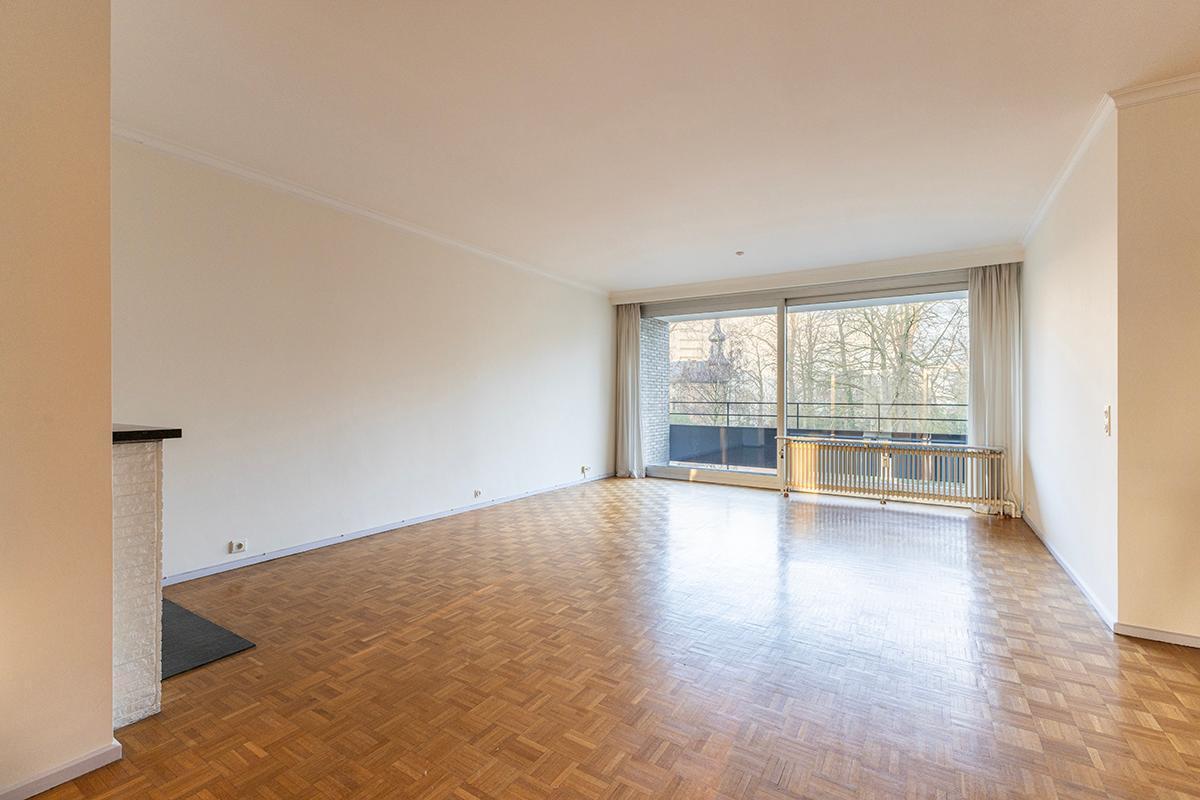 Het appartement omvat een ruime, lichte inkomhal op parket voorzien van ingemaakte vestiairekasten, een lichtrijke L-vormige woonkamer/eetkamer met open haard en op parket. Een eenvoudige ingerichte keuken met ruimte voor een ontbijthoek, een apart gastentoilet met handenwasser, een berging, een badkamer met douche, enkele wastafel en aansluiting voor een wasmachine. 2 slaapkamers op parket, beiden reeds voorzien van ingemaakte kasten en beiden met toegang tot het terras achteraan. Tevens privatieve kelder inbegrepen. Overal aluminium ramen voorzien van dubbele beglazing.