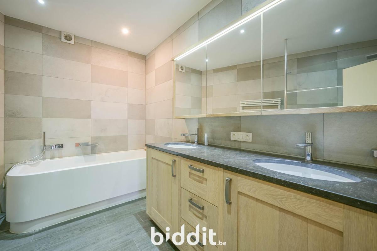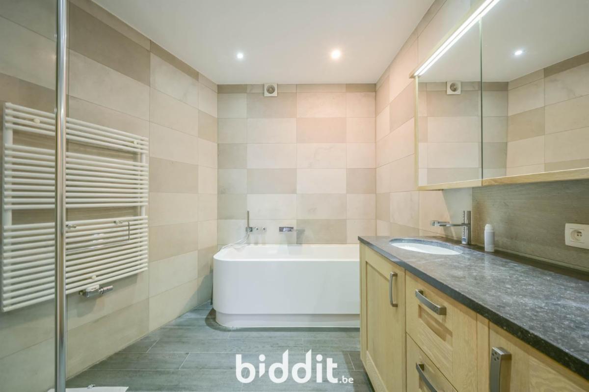 Op de eerste verdieping bevindt zich een ruim en lichtrijk appartement met groot privatief terras. De woonst beschikt over een aparte inkomhal met gastentoilet, een gezellige zitkamer met parketvloer, en een ruime leefruimte met houtkachel. De moderne, volledig uitgeruste keuken sluit naadloos aan op de eetkamer, die toegang geeft tot het deels overdekte terras met veranda — perfect om in alle rust te genieten. Er zijn drie volwaardige slaapkamers, twee praktische bergruimtes en een stijlvolle, recent gerenoveerde badkamer met ligbad, aparte douche en dubbele wastafel.