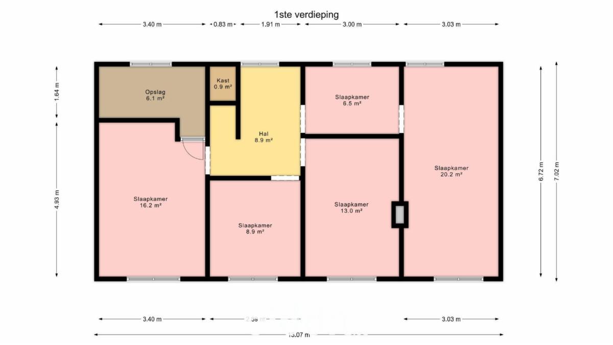 Op de eerste verdieping bevinden zich 5 aparte ruimtes, naar eigen wensen in te vullens als slaapkamer/hobbyruimte.