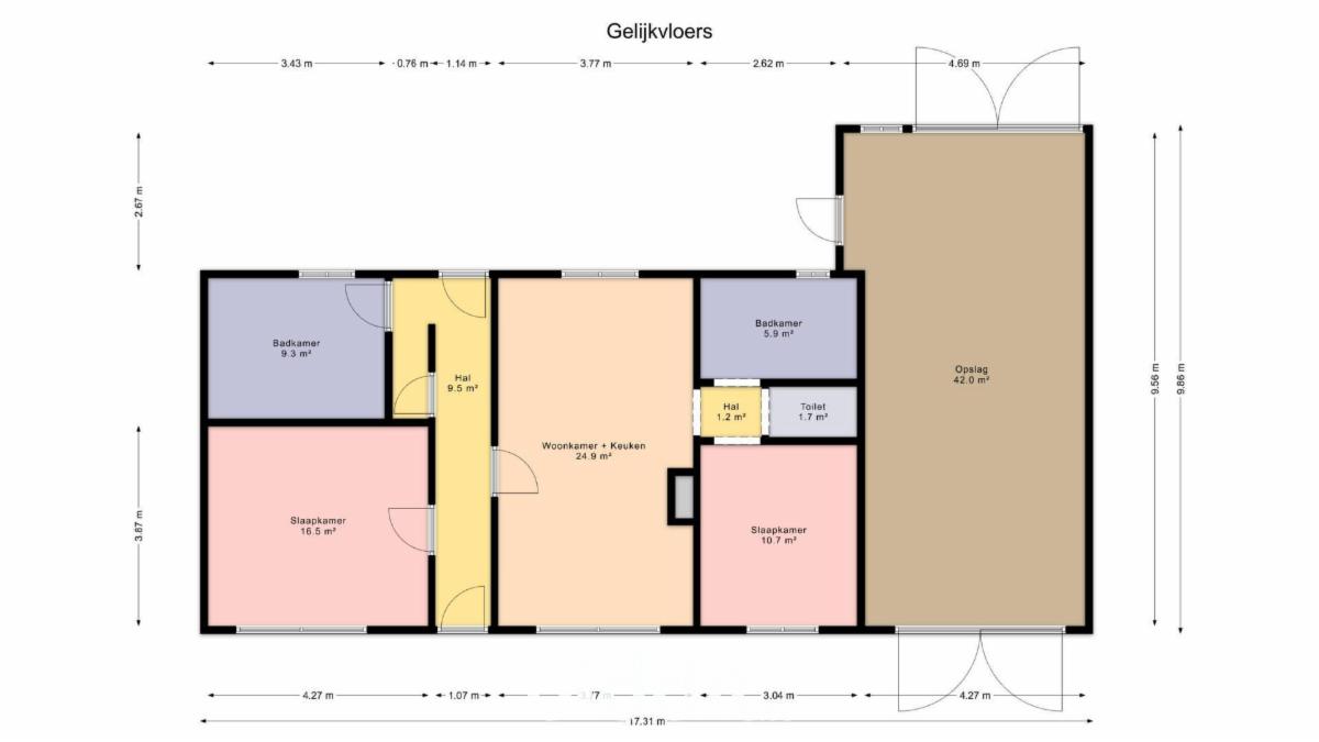 De woning beschikt op het gelijkvloers over een inkomhal, een woonkamer met keuken, 2 slaapkamers, 2 badkamers waarvan één met toilet en een opslagruimte.