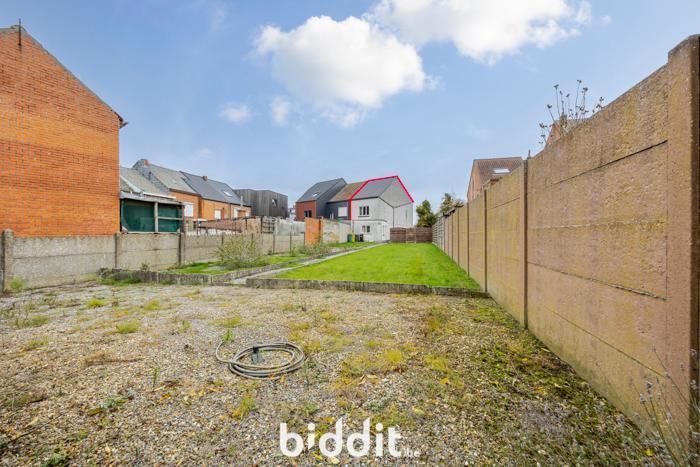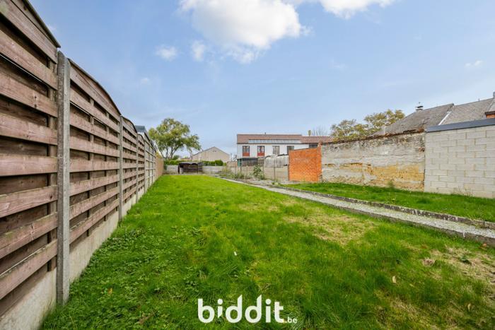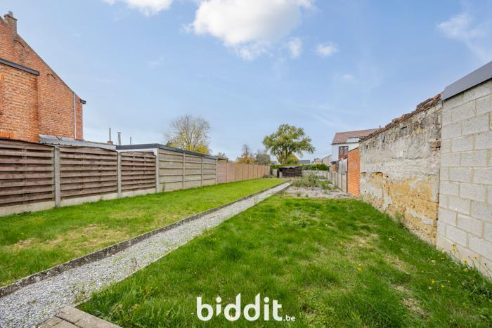 De toegang tot de tuin is via een ijzeren poort en de tuin is volledig omheind met betonnen platen, wat de privacy verhoogt. De tuin bevat een grasveld met een wandelpad van steenslag.