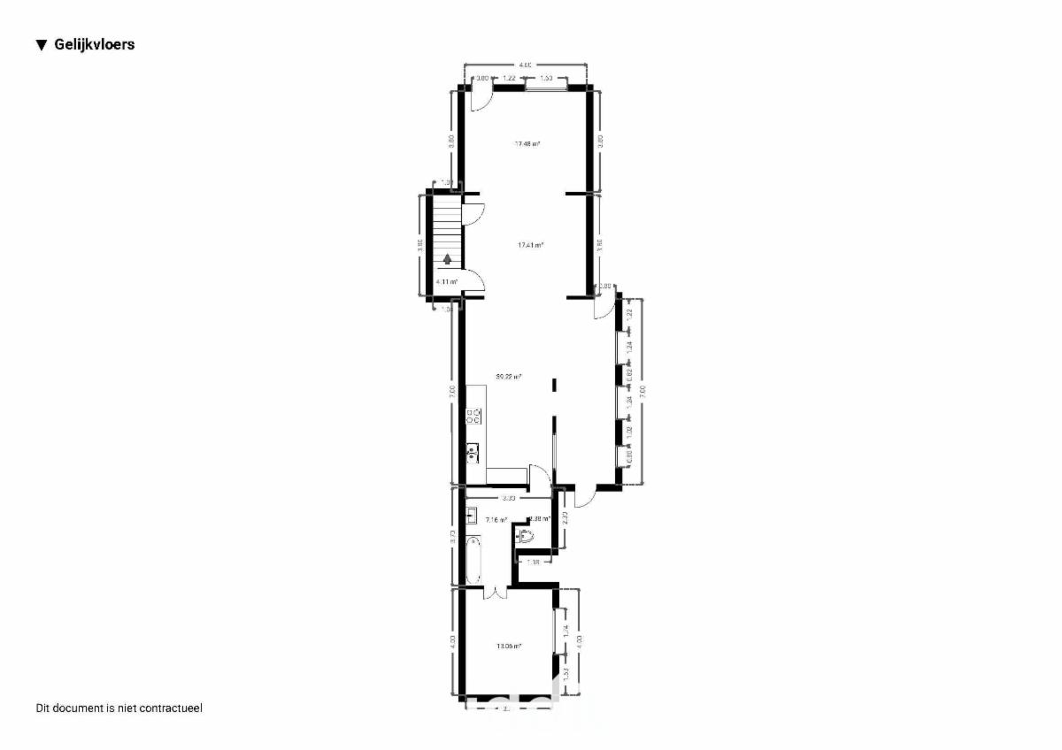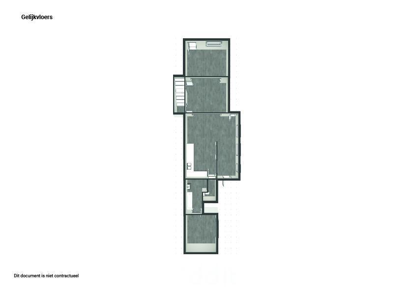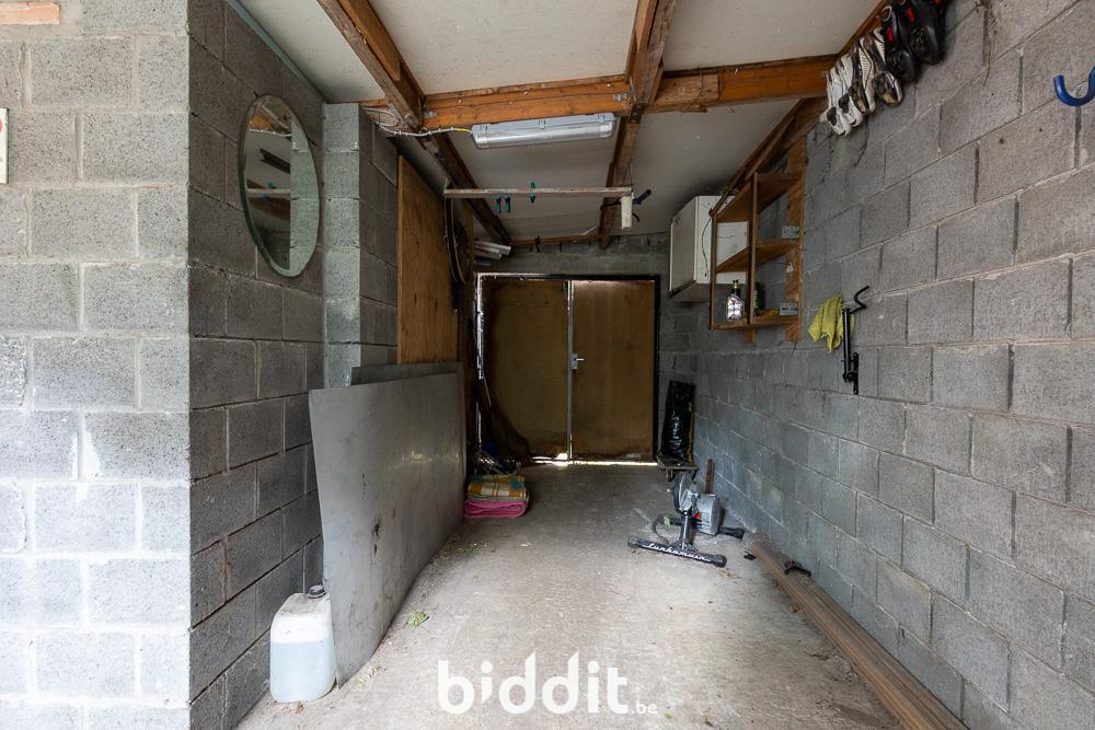 Het gelijkvloers bestaat uit een woonkamer, keuken, polyvalente ruimte, WC, badkamer met WC, slaapkamer, berging, garage.