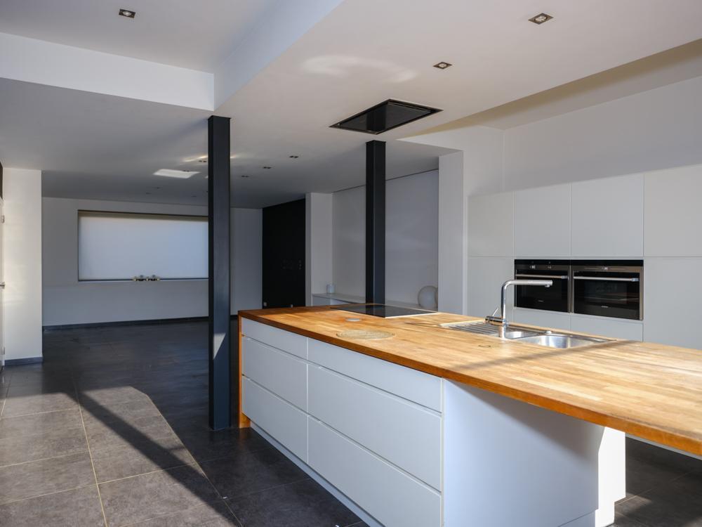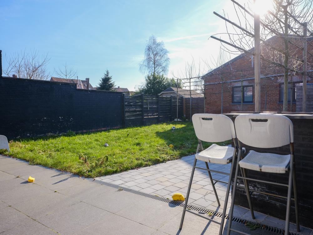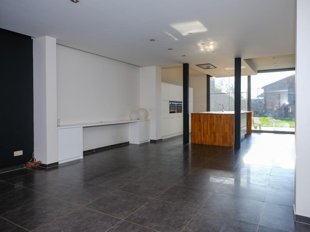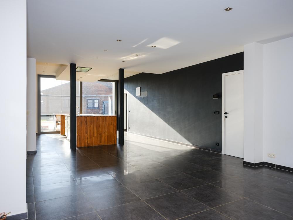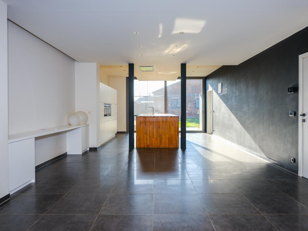 - gelijkvloers: inkomhal met toilet - badkamer bestaande uit dubbele lavabo, bad en douche - salon met aansluitend open leefkeuken met eiland en ingemaakte kasten met zicht op de tuin - een afzonderlijke ruimte bereikbaar via de straat;