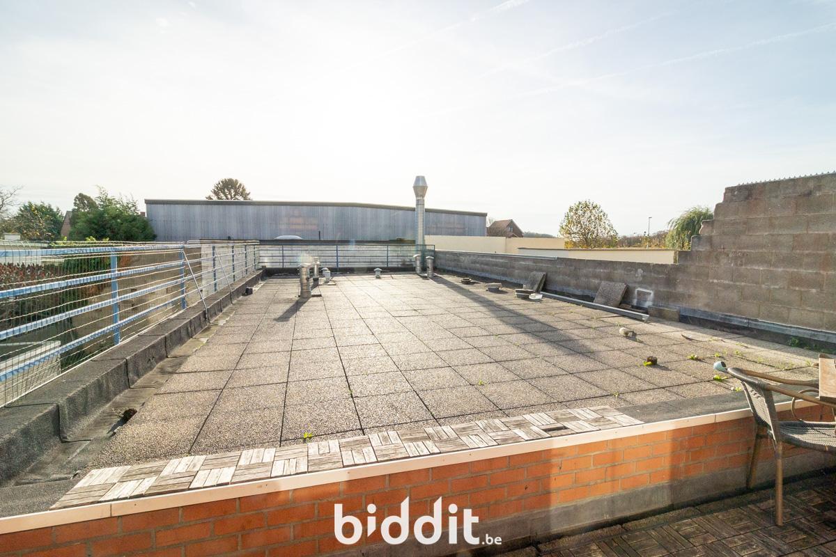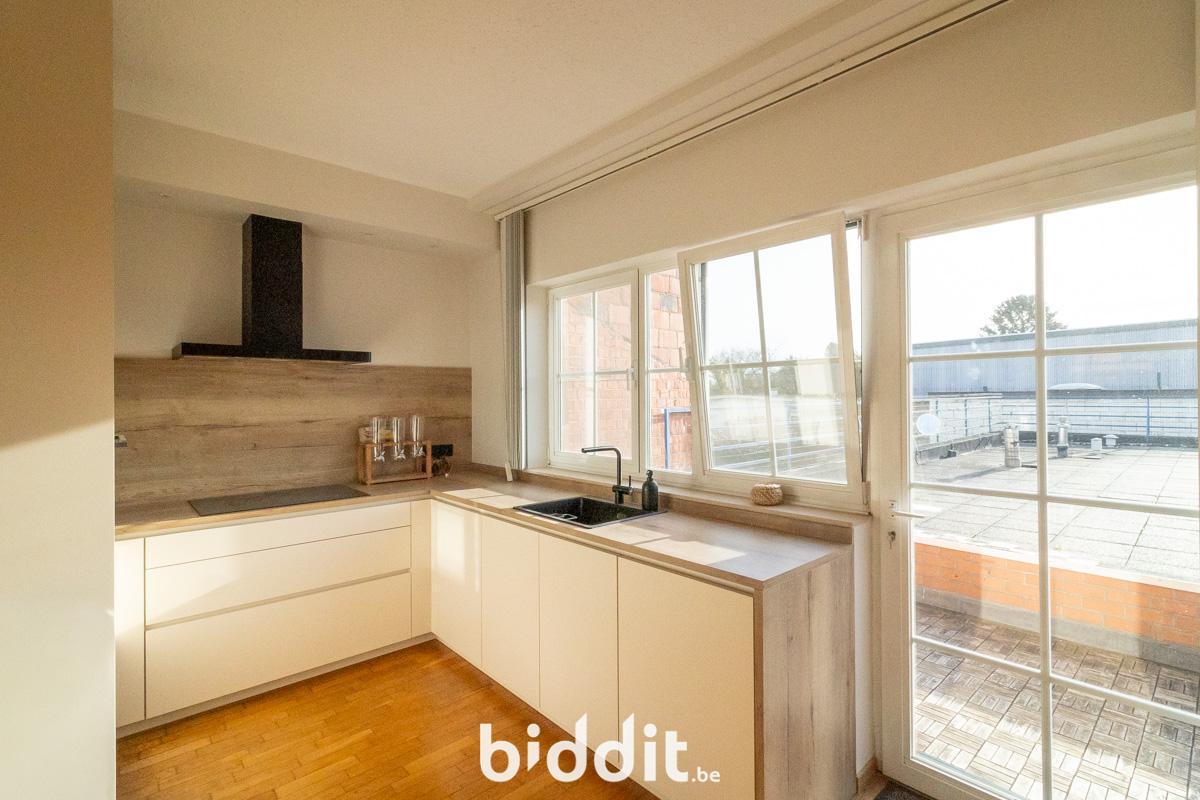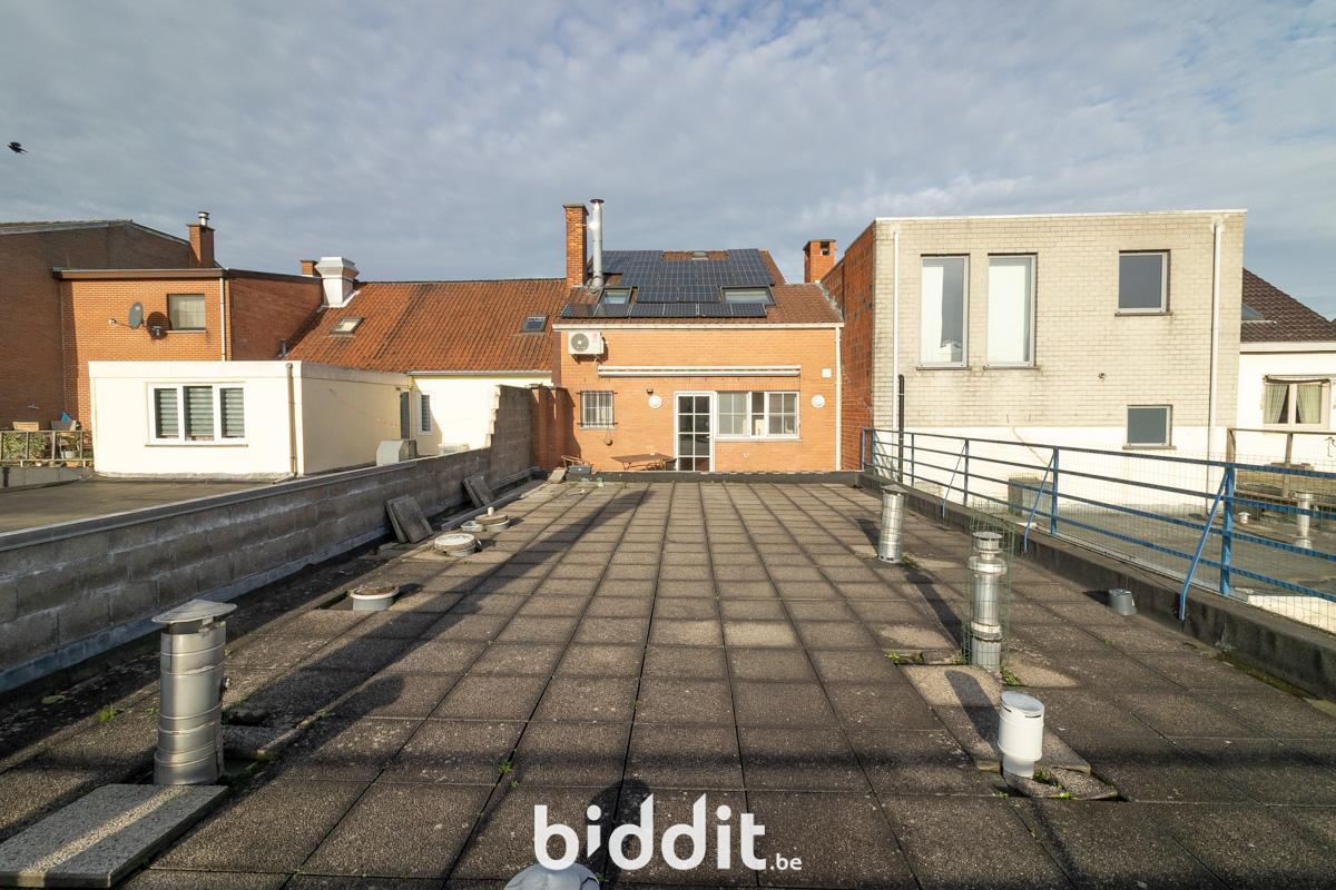 - 1ste verdieping: inkomhal, apart toilet met aansluiting was-en droogmachine, ruime en lichtrijke woon-en eetkamer, open keuken met toegang tot het zuid-georiënteerde dakterras.