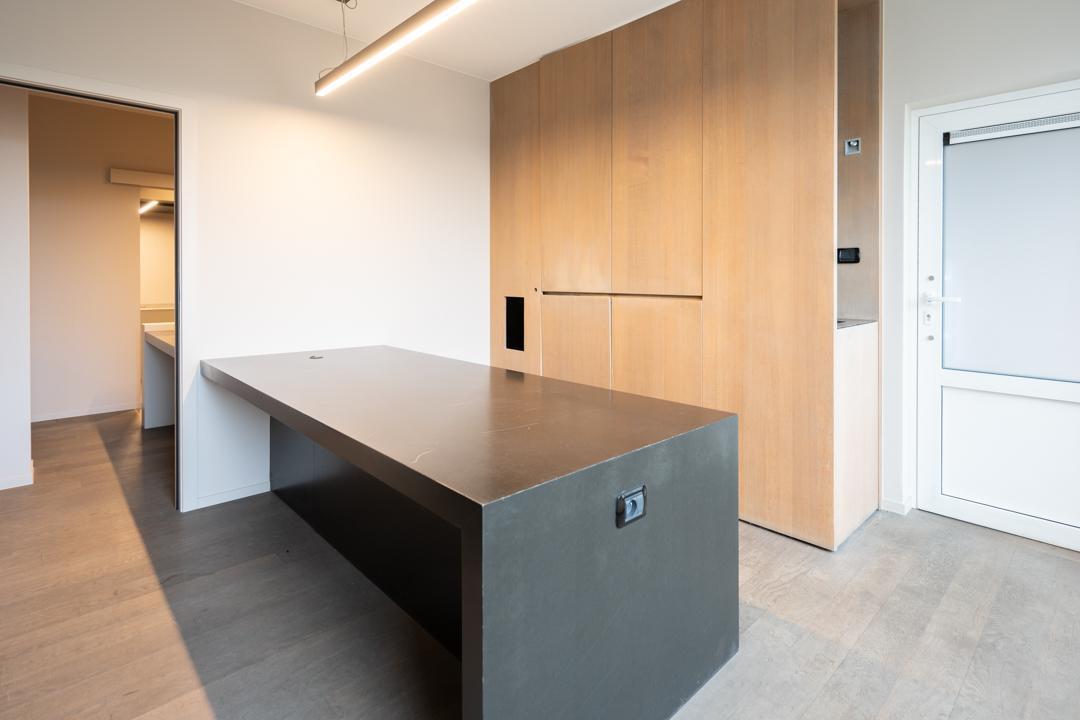 Indeling: ontvangstbalie met twee bureaus, WC, bureau, keuken, groot kantoor.
