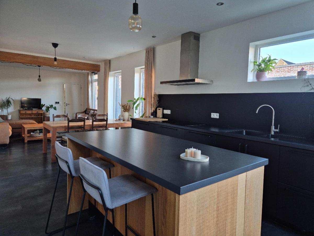Bij het binnenkomen wordt u verwelkomd in de inkomhal, die toegang geeft tot de lichtrijke leefruimte. Hier geniet u van een gezellige living met ingebouwde kasten en aansluitend een open, volledig ingerichte keuken. De keuken is uitgerust met hedendaagse toestellen, waaronder een inductiekookplaat, dampkap, vaatwasser, oven, microgolfoven en koelkast.