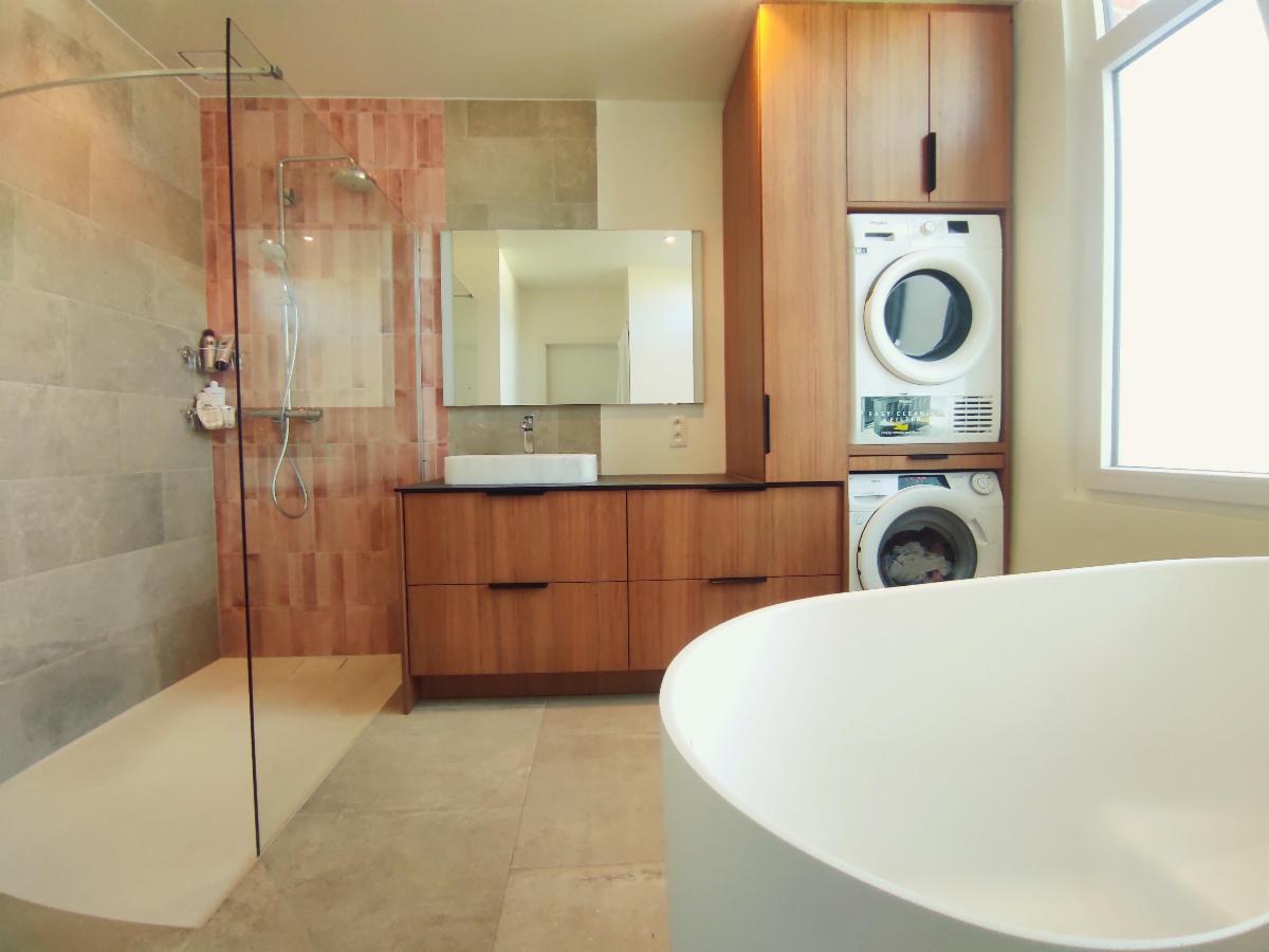 Op het gelijkvloers bevindt zich een gerenoveerde badkamer met een inloopdouche als een ligbad, een lavabo en ingebouwde kasten. Verder zijn er nog een apart toilet, een technische ruimte en een berging aanwezig.