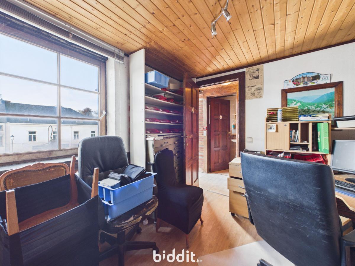 1e étage (115 m²): Niveau composé d’une salle de réception de 75 m2, un dégagement central avec espace vestiaire, accès aux 2 pièces arrière initialement rattachées au n° 19, un bureau, un WC séparé et une sortie de secours donnant sur la terrasse de ± 15 m².